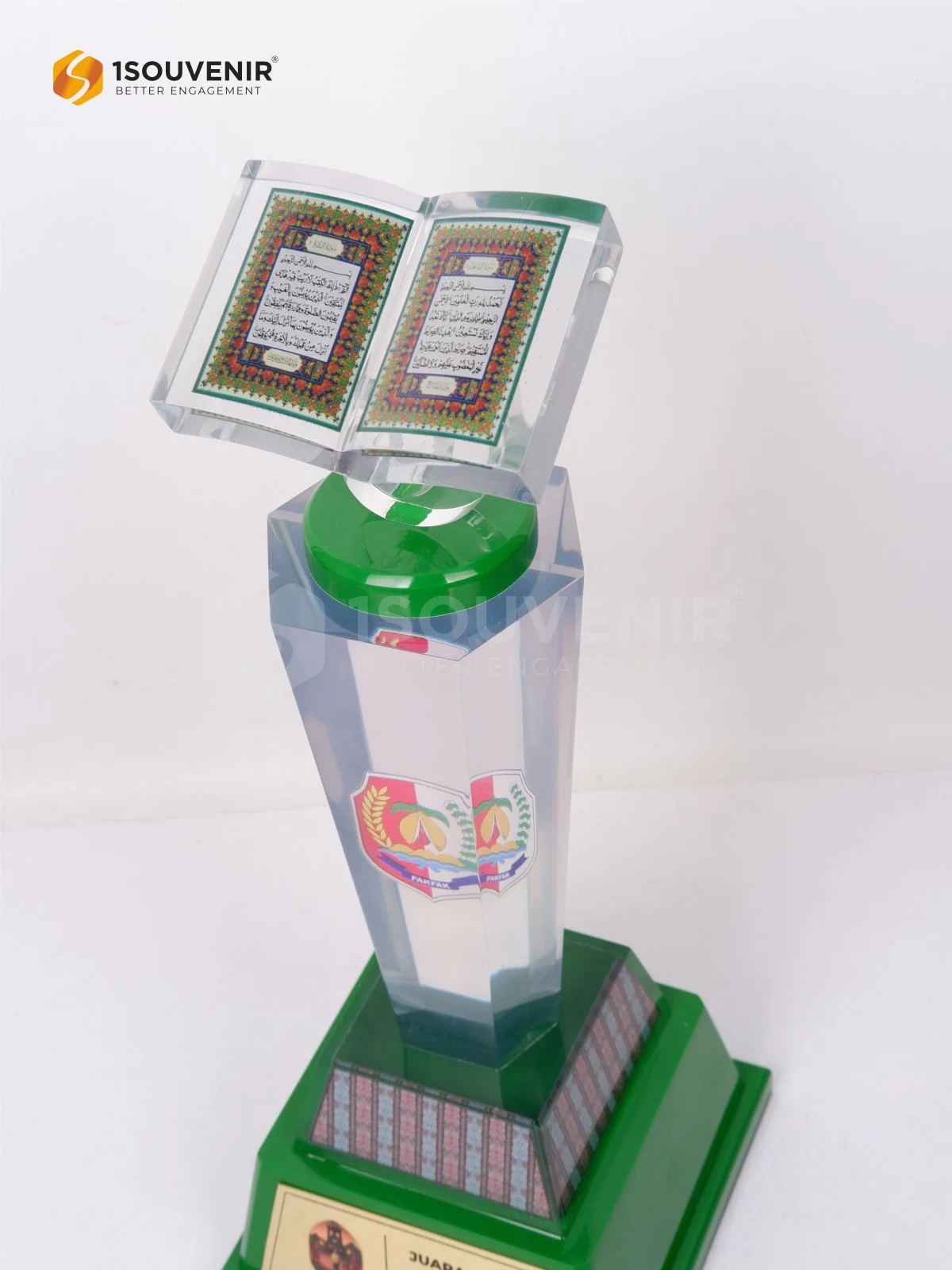 | Teknik | al-qur'an transparansi print cat silver cor resin, akrilik cutting print UV cor resin, motif transparansi print cat silver cor resin 4 sisi, materi kuningan etsa cat logo print UV tempel luar |