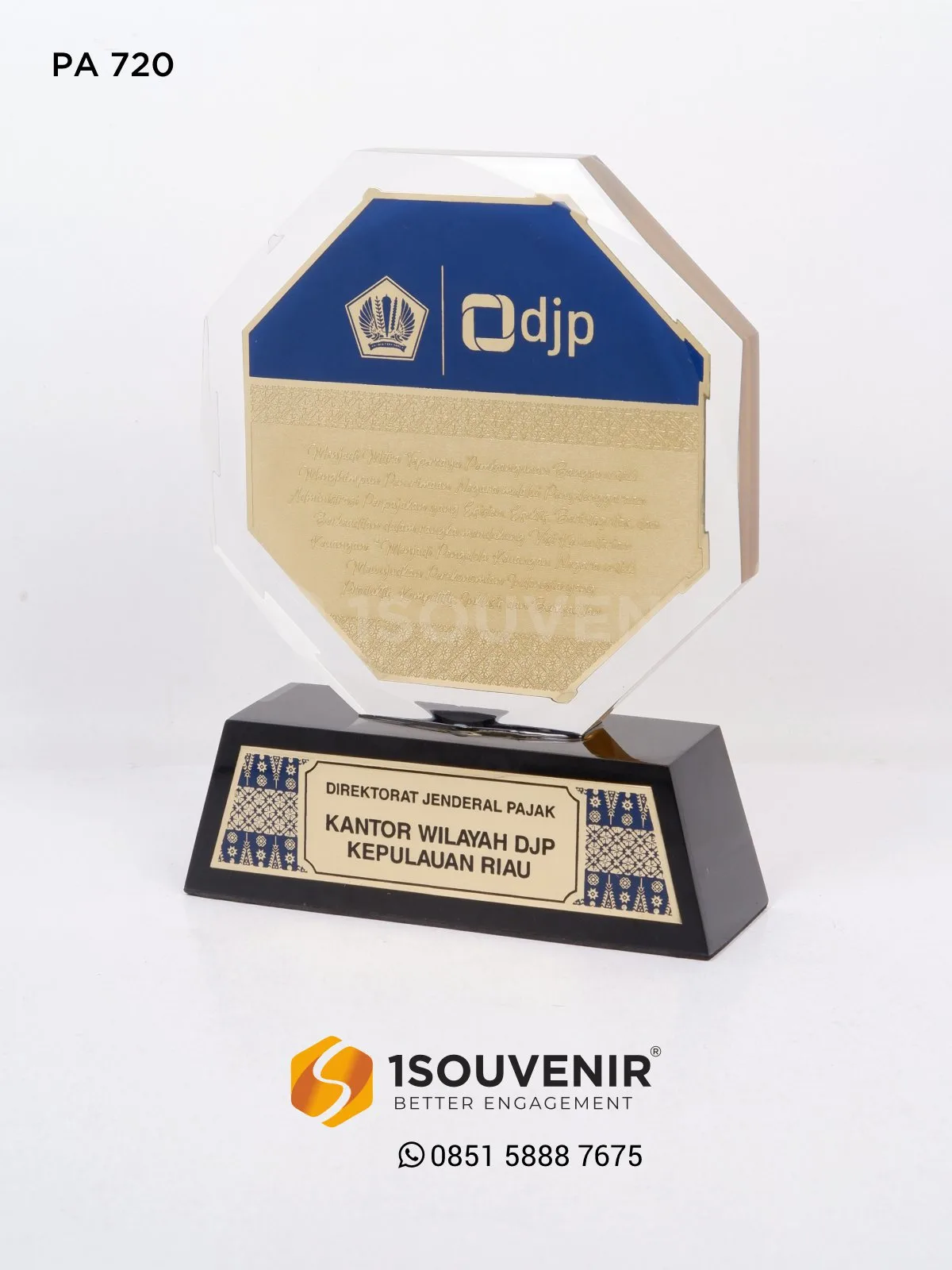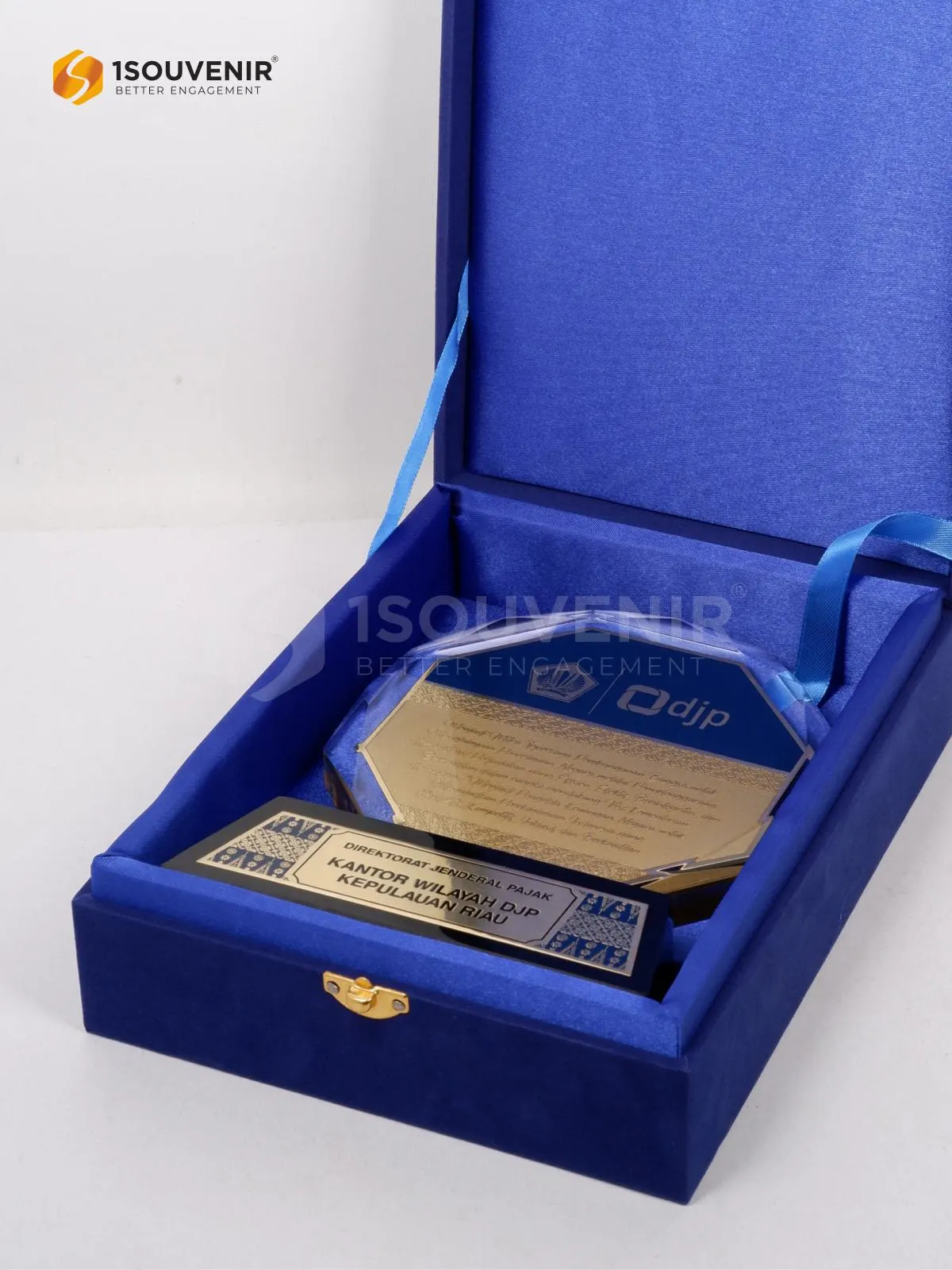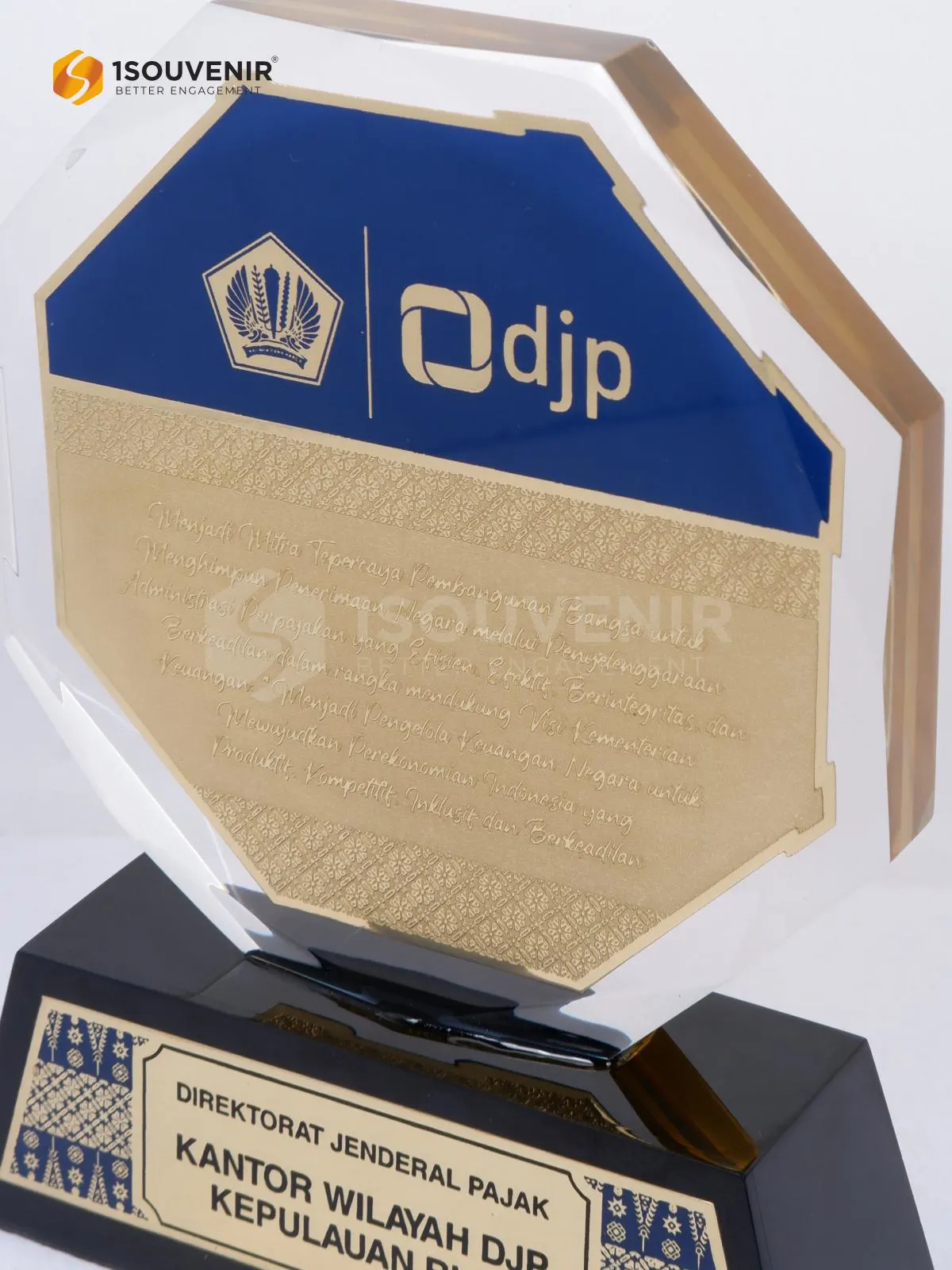 Sebagai bentuk penghargaan atas kontribusi dan kerja sama yang kokoh, hadir Plakat Dirjen Pajak Kepri yang elegan. Plakat akrilik ini mengusung desain modern dengan sentuhan warna emas dan biru yang melambangkan kepercayaan serta kehormatan.