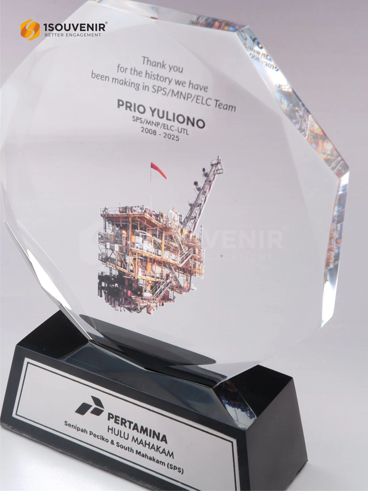 Plakat Pertamina Hulu Mahakam ini dibuat sebagai tanda penghormatan atas masa purna tugas Prio Yuliono, yang telah mengabdi sejak 2008 hingga 2025. Plakat akrilik ini menjadi simbol apresiasi atas perjalanan panjang yang dibangun bersama tim SPS/MNP/ELC.