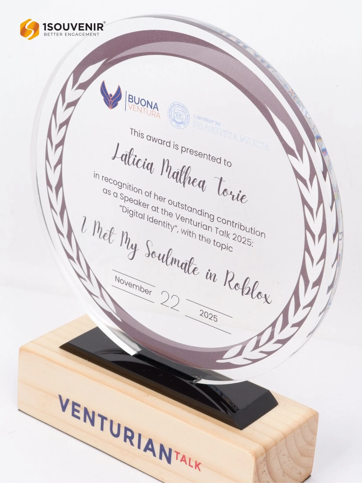 Sebagai bentuk penghargaan, Plakat Venturian Talk dianugerahkan kepada para pembicara atas kontribusi pemikiran, komitmen, dan pengalaman yang dibagikan. Plakat akrilik ini menjadi simbol kenangan atas peran mereka dalam menciptakan momen acara yang bermakna dan membanggakan.