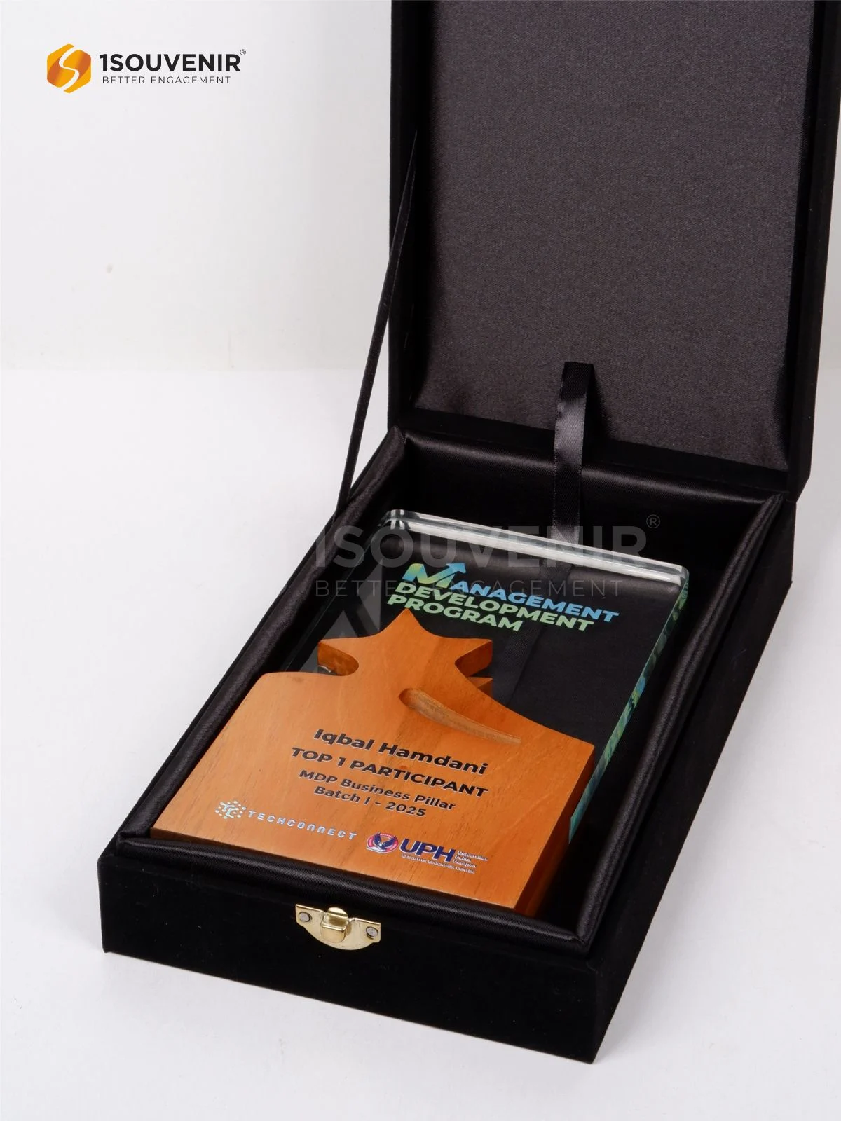 Plakat Top 1 Participant dihadirkan sebagai bentuk penghargaan atas prestasi tersebut. Mengusung material kayu dan akrilik, plakat ini menjadi penanda momen pengakuan atas kerja keras, pemikiran strategis, dan semangat pengembangan diri.