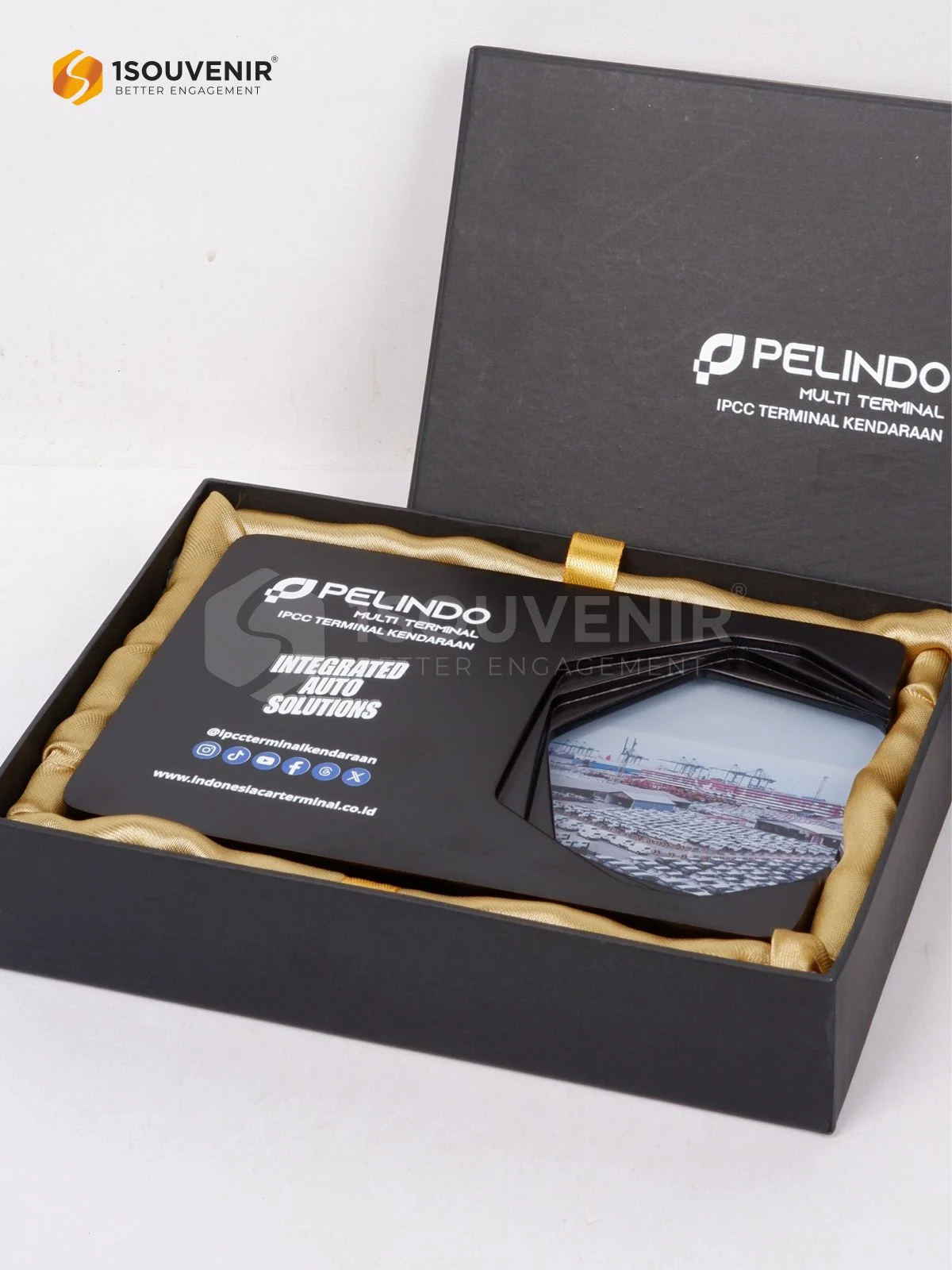 Plakat Pelindo Multi Terminal ini dihadirkan sebagai cendera mata yang sarat makna. Mengusung desain modern dengan visual terminal kendaraan yang khas, plakat ini menjadi simbol apresiasi atas kontribusi dan kerja sama yang telah terjalin.