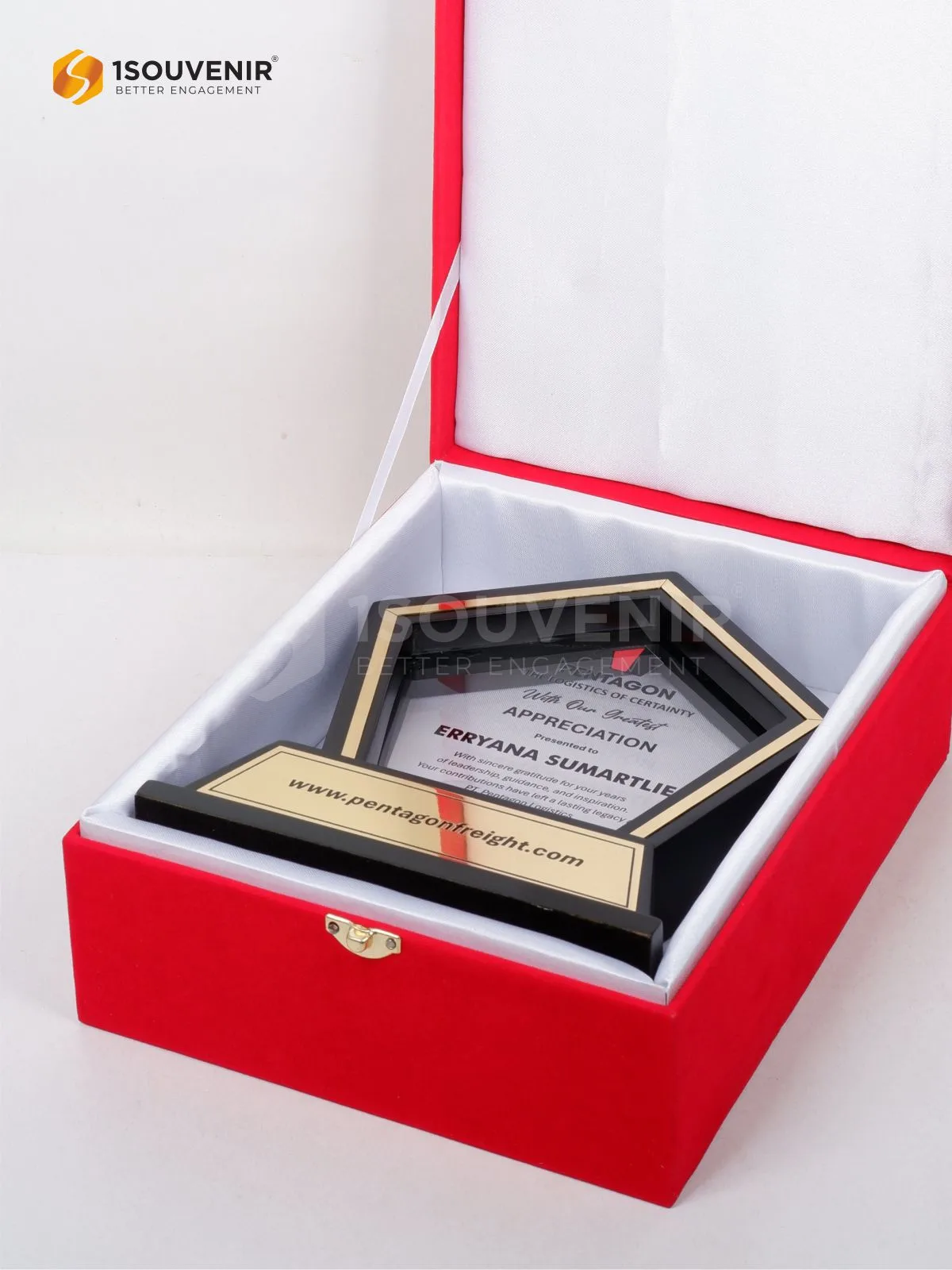 Sebagai penghargaan, Plakat Pentagon Logistics dirancang dalam bentuk plakat frame berbentuk pentagon yang elegan. Kombinasi warna hitam dan emas menciptakan kesan mewah dan berwibawa, merepresentasikan profesionalitas serta loyalitas yang patut diteladani.