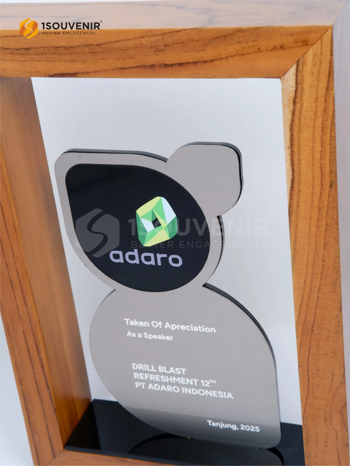 Sebagai bentuk penghargaan kepada para narasumber, disiapkan plakat frame bergaya eksklusif. Desainnya memadukan gaya modern dengan elemen visual khas Adaro, sehingga mampu menjadi simbol apresiasi atas kontribusi ilmu yang mereka sampaikan.