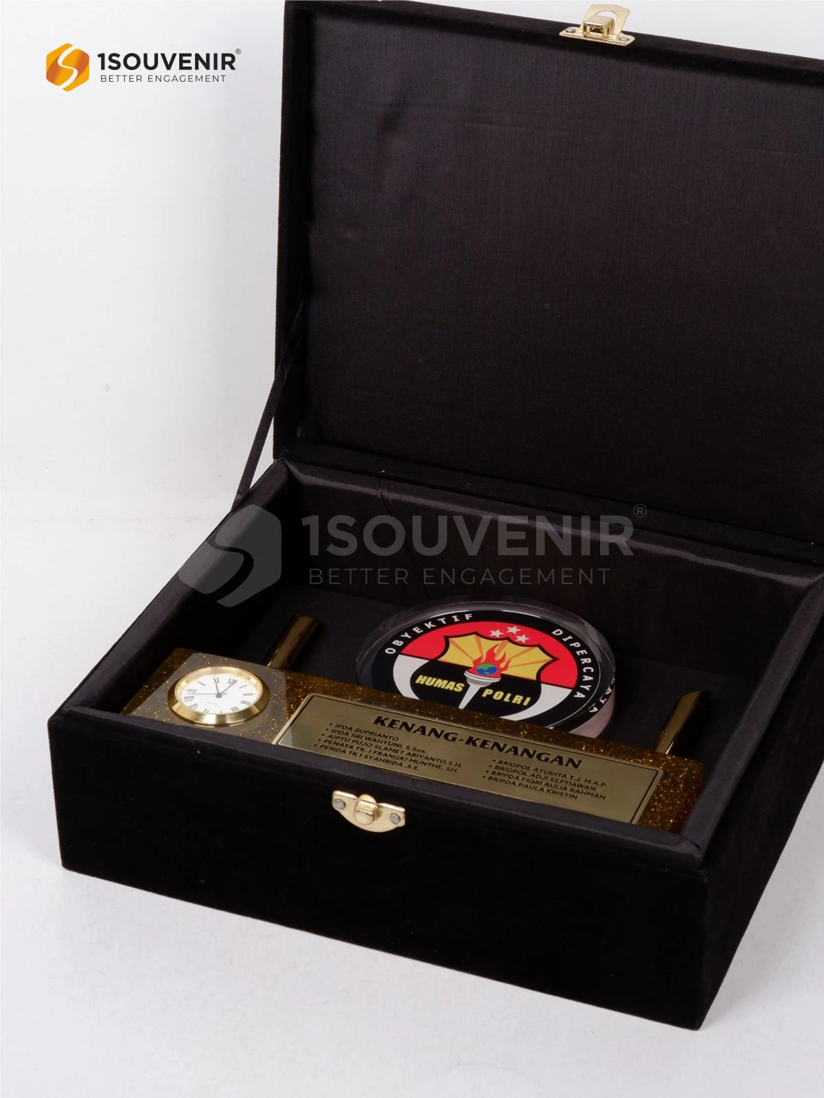 Sebagai wujud apresiasi atas kebersamaan tersebut, Plakat Humas Polri hadir sebagai kenang-kenangan eksklusif dengan desain jam mini dan dua pen holder elegan.Kombinasi fungsional dan estetik ini menjadi simbol penghargaan atas kontribusi dan perjalanan yang penuh makna.