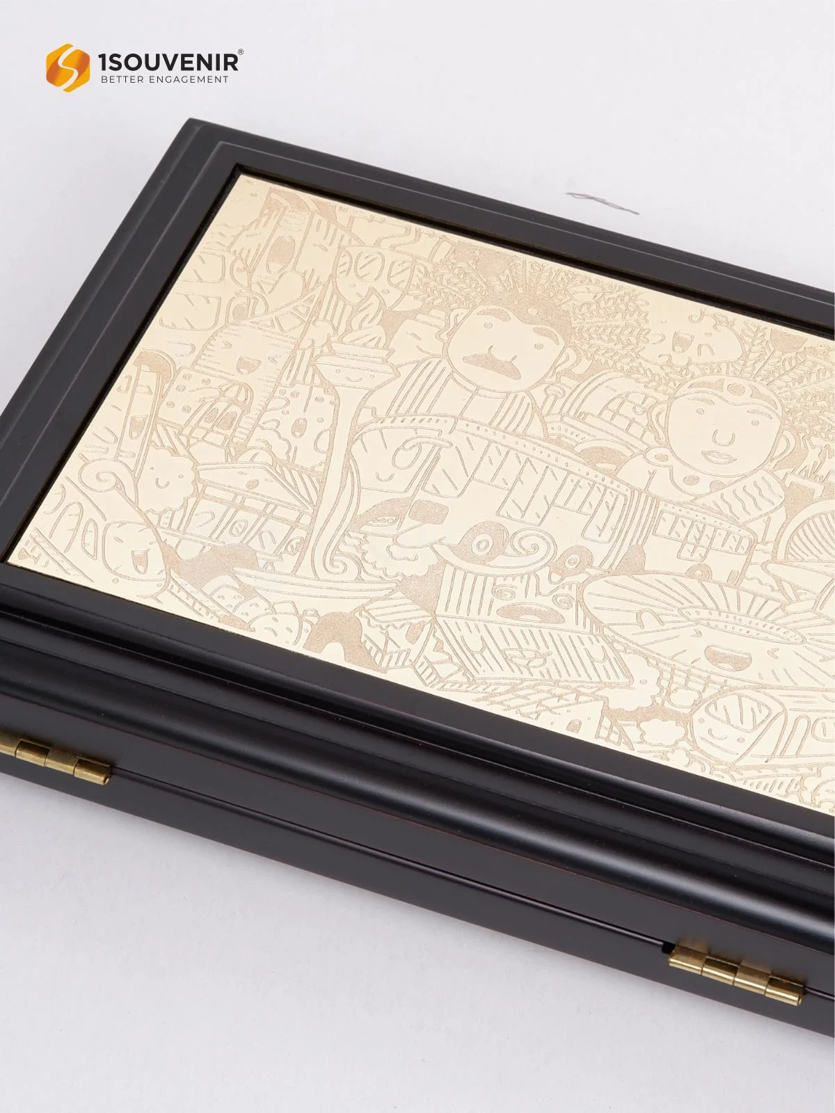 | Teknik | kuningan dalam etsa cat poles masuk ke kayu, kuningan etsa masir krom emas print UV, kuningan etsa msair cat krom emas, kuningan luar etsa masir krom emas masuk kayu |