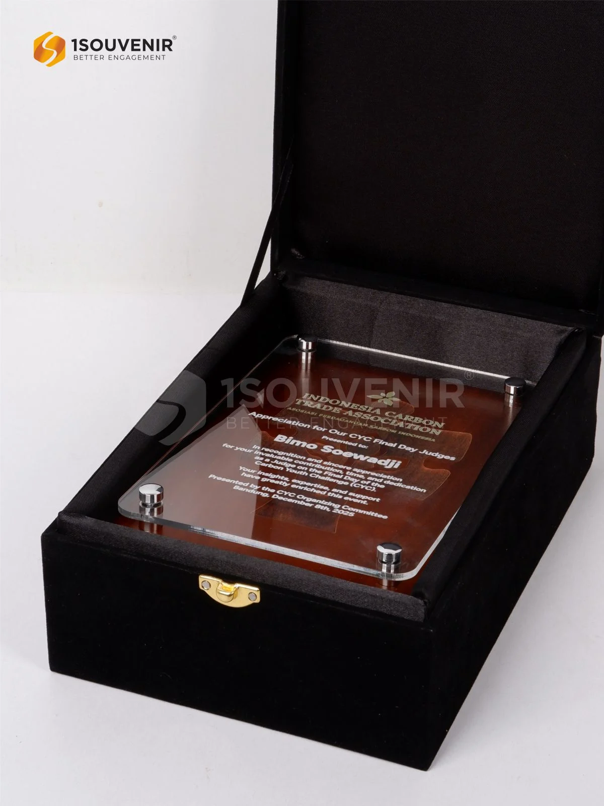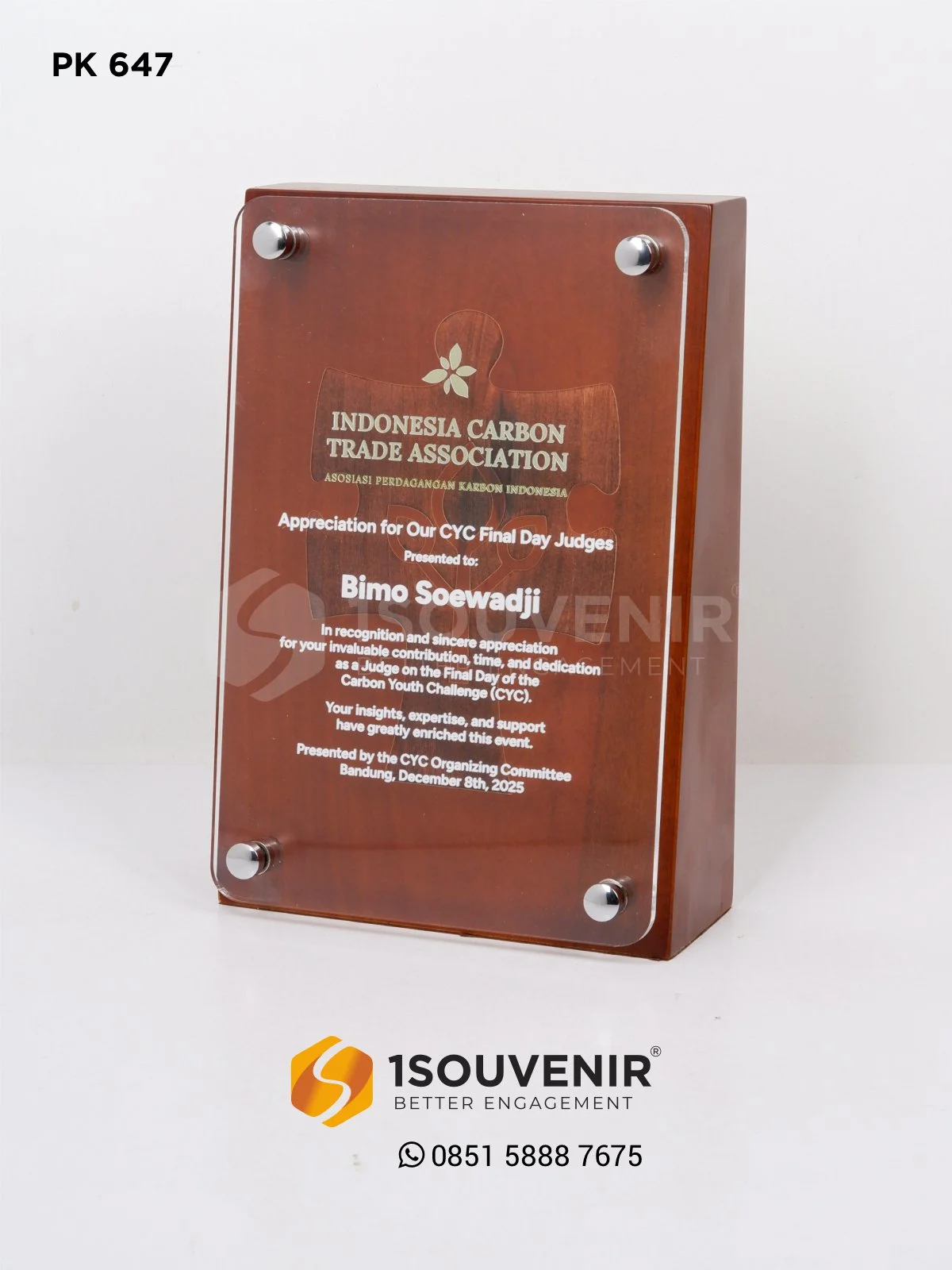 Plakat Indonesia Carbon Trade Association ini dihadirkan sebagai ungkapan penghargaan bagi para juri yang telah menilai karya pada Final Day of The Carbon Youth Challenge. Setiap elemen pada plakat kayu ini merepresentasikan kontribusi penting tersebut.
