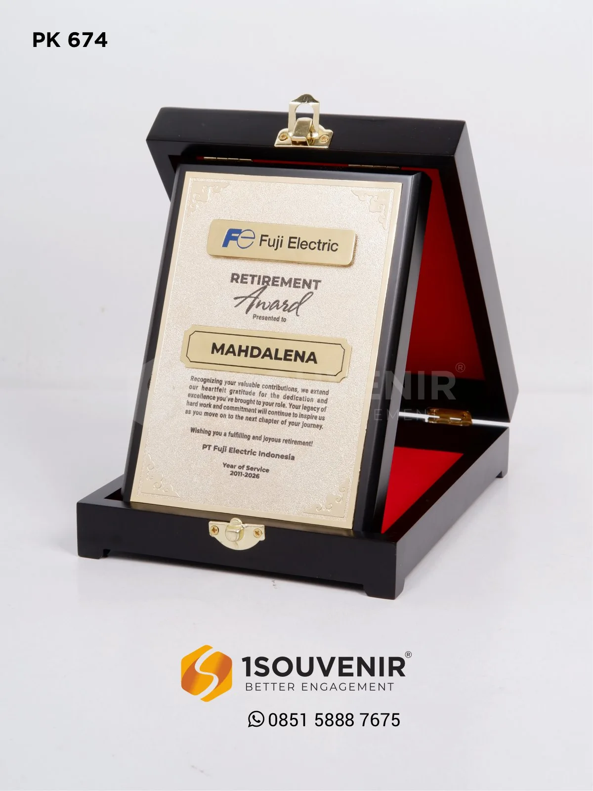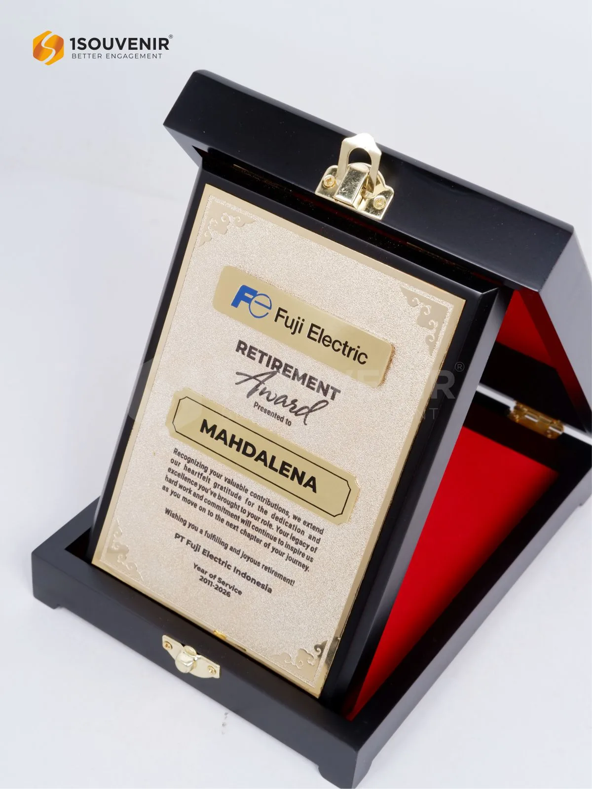 Plakat Fuji Electric Indonesia ini dihadirkan sebagai simbol penghargaan istimewa bagi karyawan yang memasuki masa purna tugas. Dikemas secara elegan dalam kotak eksklusif dengan sentuhan warna emas, plakat ini menjadi wujud terima kasih atas dedikasi dan perjalanan panjang yang penuh arti.
