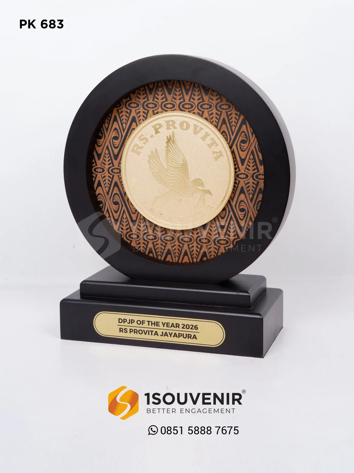 Plakat DPJP of The Year 2026 ini dirancang sebagai simbol penghormatan bagi dokter berprestasi. Mengusung desain elegan dengan sentuhan motif khas, plakat ini mampu memperkuat identitas sekaligus menyampaikan makna penghargaan yang mendalam.