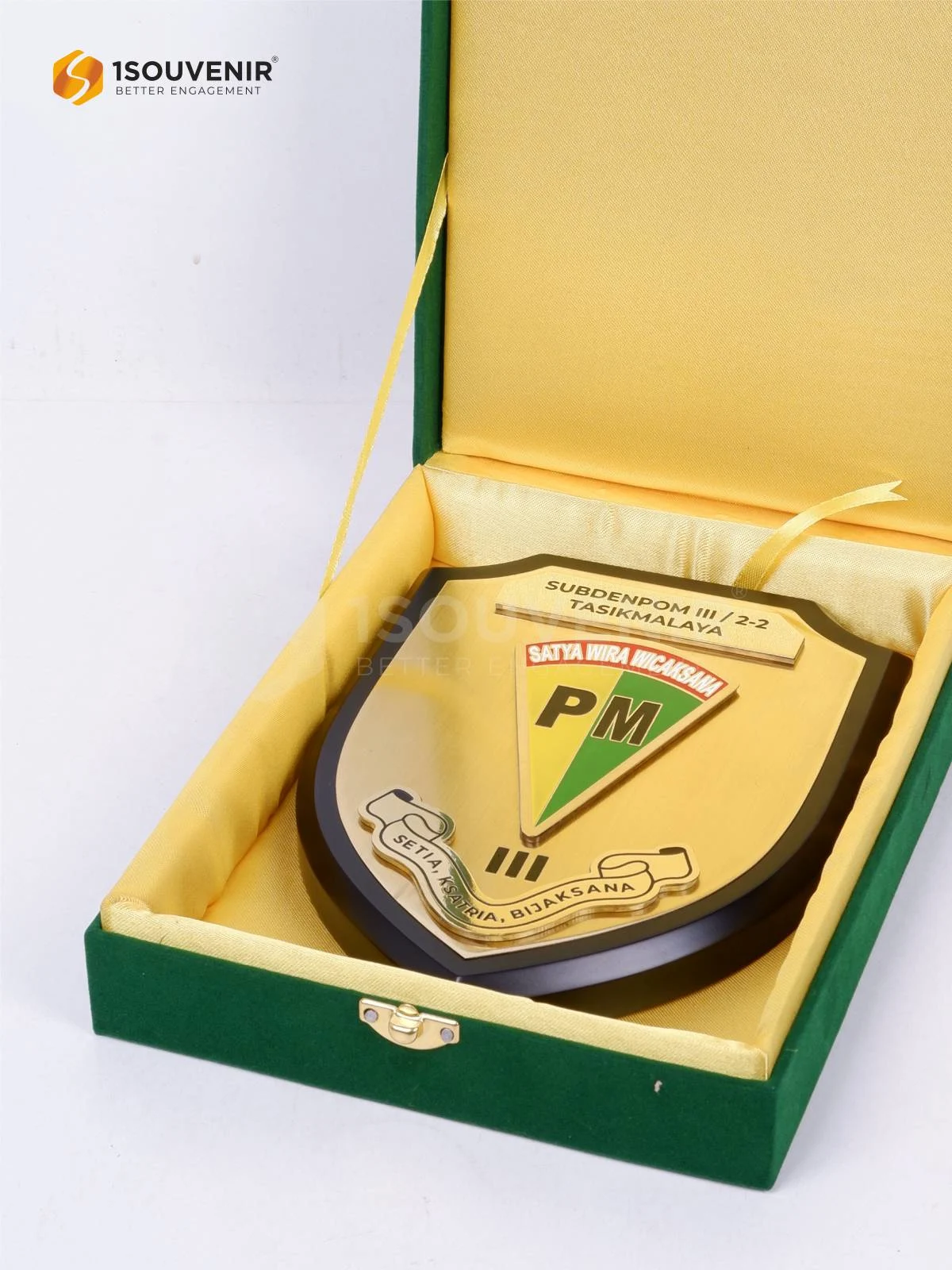 Plakat Subdenpom Tasikmalaya dihadirkan sebagai cendera mata berkelas yang menggambarkan identitas satuan. Mengusung desain berbentuk perisai yang kokoh dengan detail elegan, plakat ini merepresentasikan kekuatan, kehormatan, dan rasa bangga terhadap institusi.