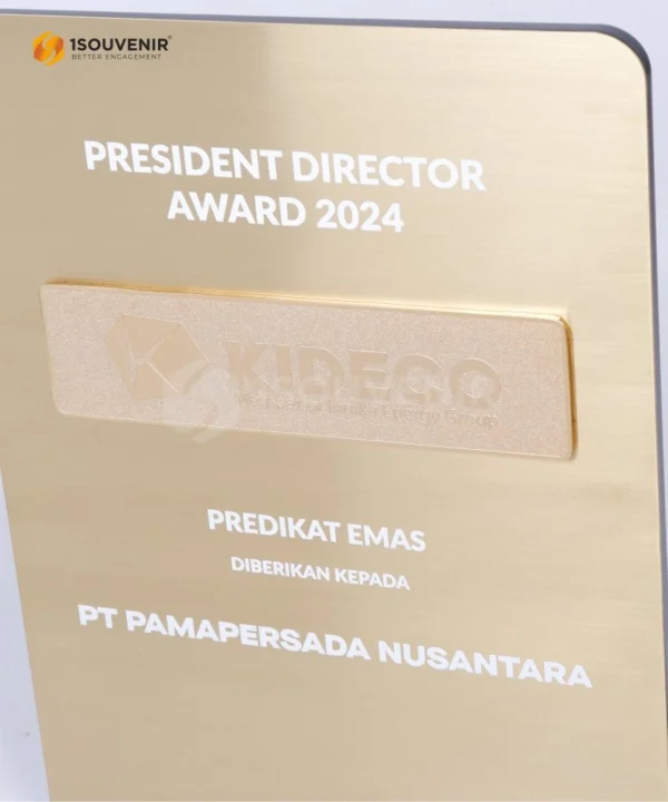 Plakat President Director Award 2024 dibuat dari logam premium dengan tampilan emas yang elegan, menonjolkan desain eksklusif yang berkelas. Detail tulisan yang presisi serta finishing berkualitas tinggi memberikan sentuhan profesional, menjadikannya simbol penghargaan yang layak dalam berbagai acara perusahaan maupun institusi ternama.