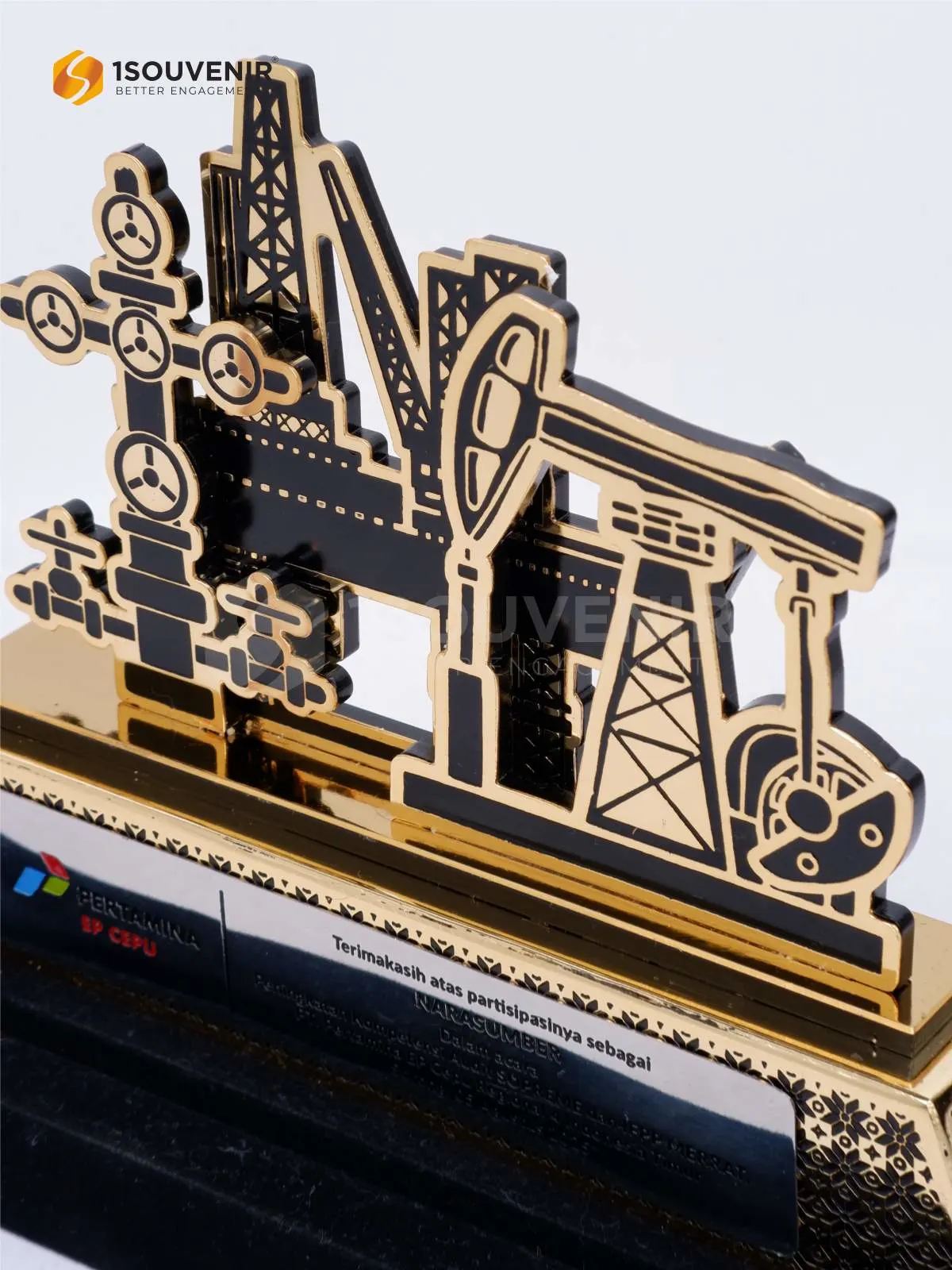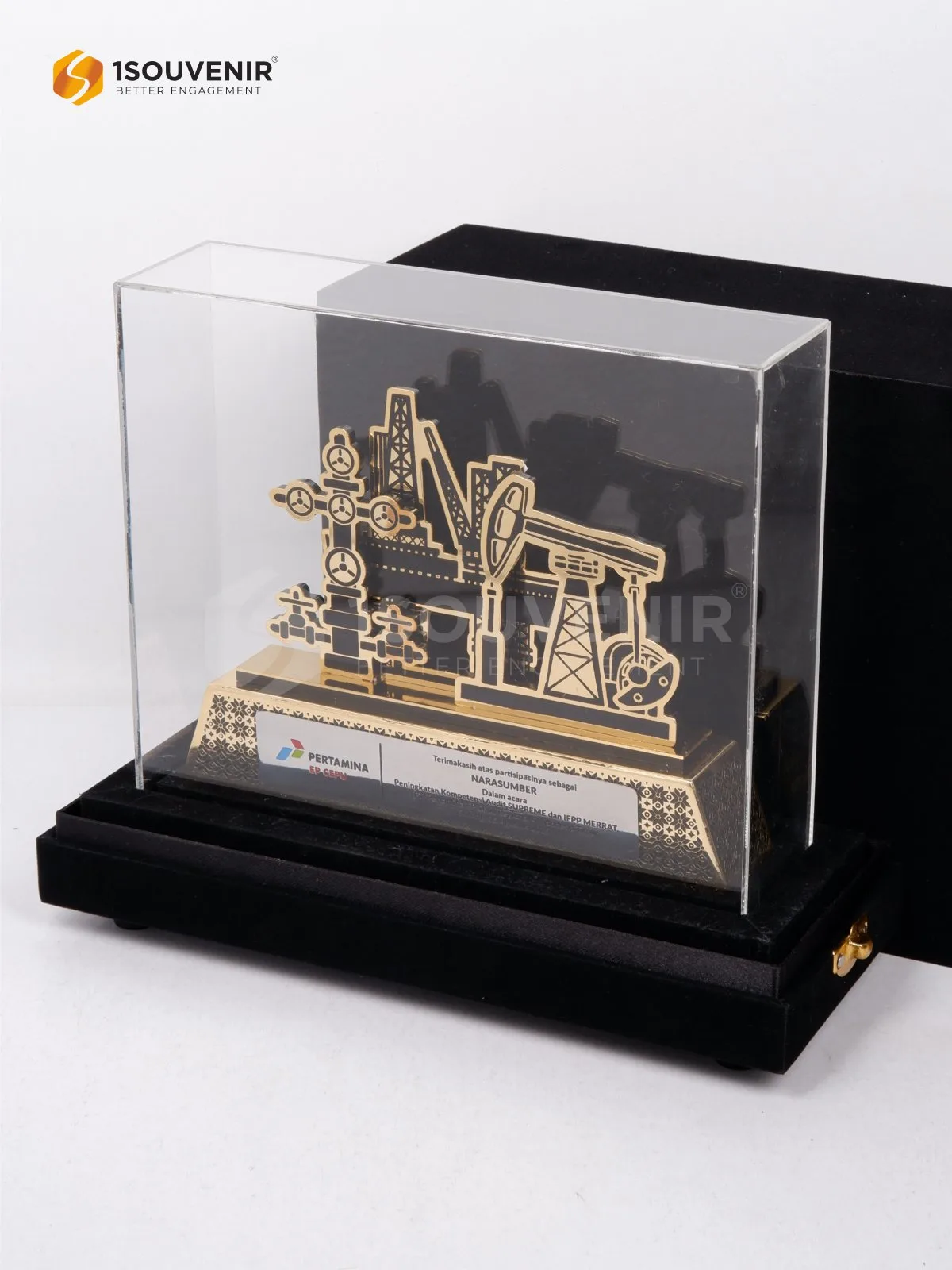 Sebagai bentuk terima kasih kepada para narasumber yang telah berbagi ilmu dan pengalaman, dihadirkan plakat Peningkatan Kompetensi Audit SUPREME dan IFPP MERRAT. Plakat logam ini dibuat dengan desain elegan dan sentuhan ilustrasi industri migas, menjadikannya simbol apresiasi yang penuh makna.
