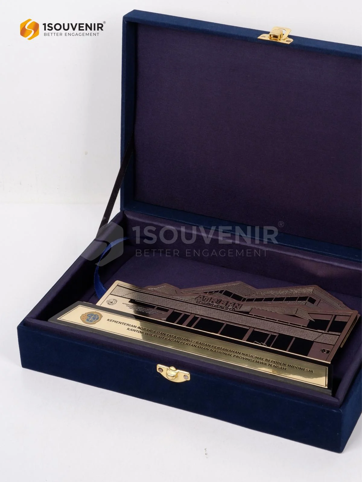 Plakat Gedung Kementerian ATR/BPN RI dihadirkan sebagai kenang-kenangan yang mengabadikan perjalanan institusi. Representasi visual gedung pada plakat logam melambangkan dedikasi aparatur dalam mengemban amanah pelayanan publik dan pengabdian kepada negara.