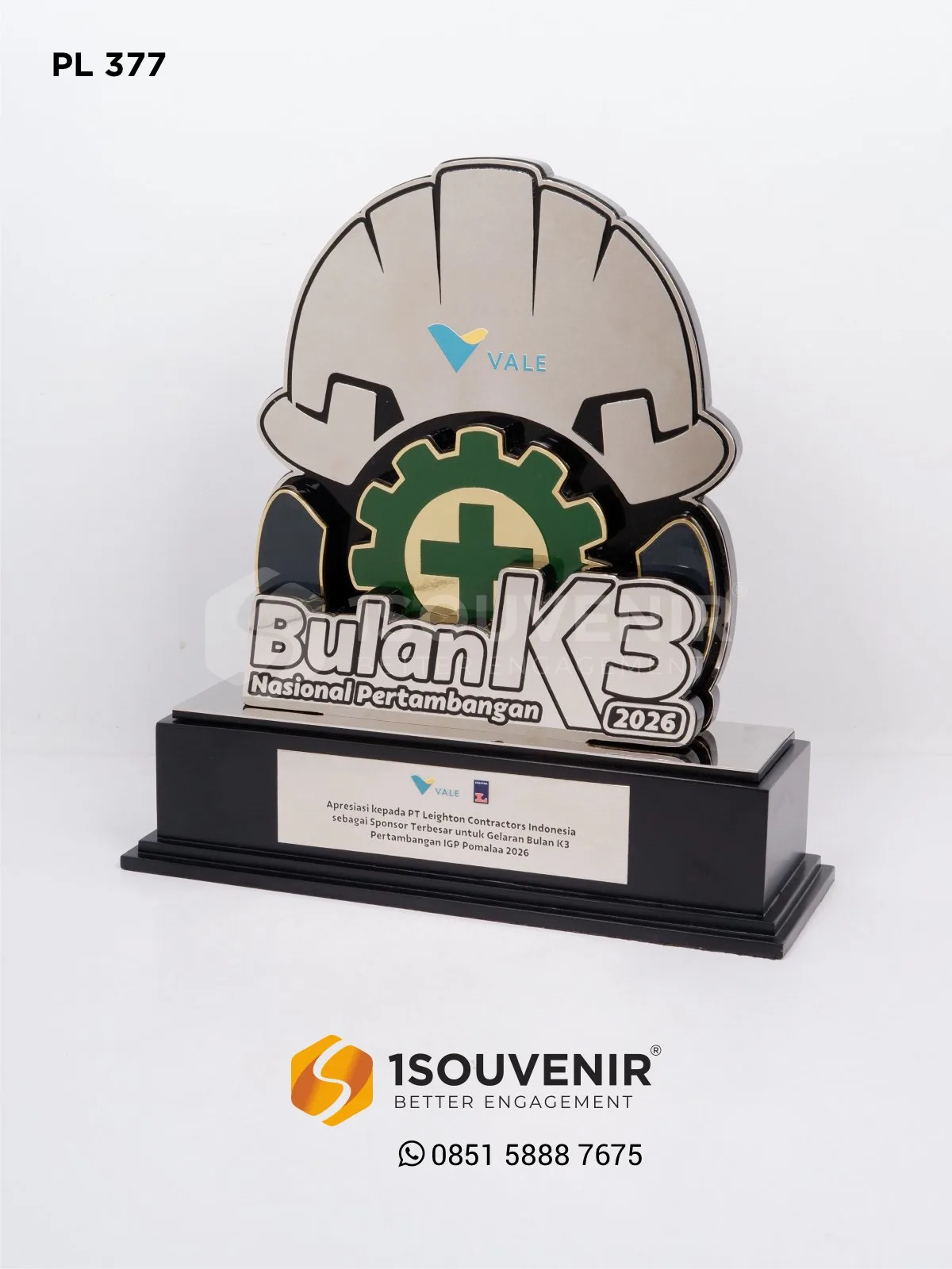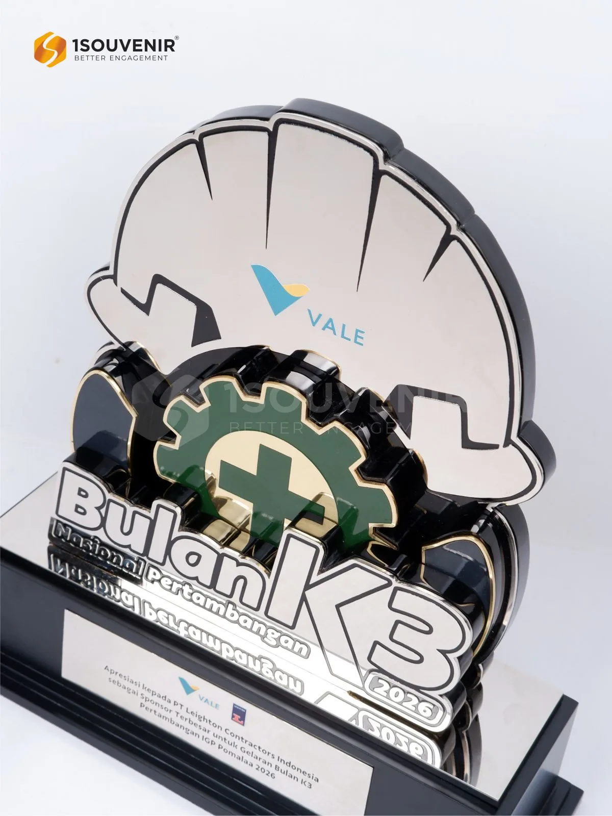 Plakat BK3 Nasional Pertambangan dirancang elegan dengan elemen helm dan simbol keselamatan sehingga menjadi penghargaan yang berkesan. Plakat logam ini menjadi tanda apresiasi atas dukungan sponsor dalam menyukseskan acara.