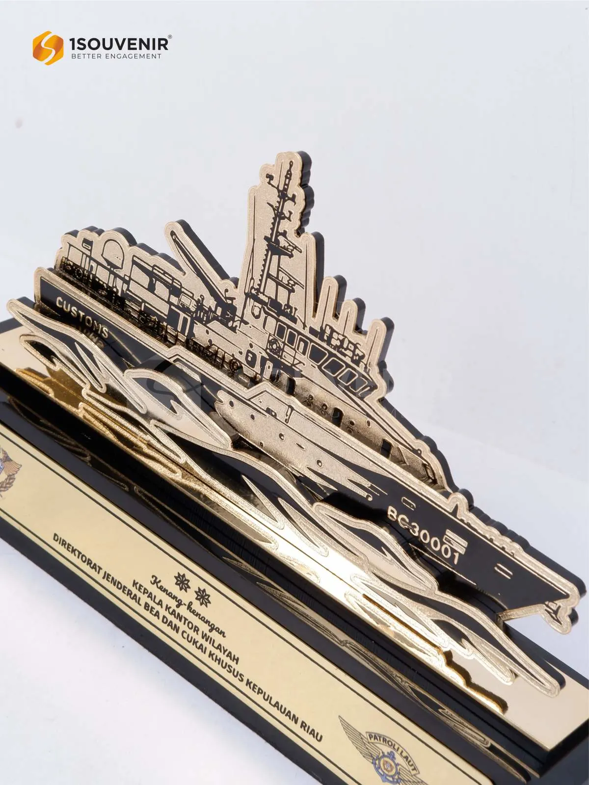 Plakat Dirjen Bea Cukai Kepulauan Riau ini dirancang sebagai cendera mata yang mencerminkan karakter maritim yang kuat. Detail kapal patroli dengan balutan warna emas memberikan nuansa tegas, berwibawa, sekaligus sarat makna.