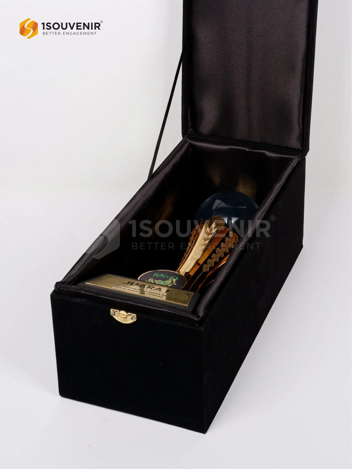 | Teknik | kuningan pulau kalimantan cor resin bola, logo kuningan cutting krom emas full print UV, badan motif kuningan etsa masir patri krom emas, materi kuningan etsa cat poles tempel dudukan |