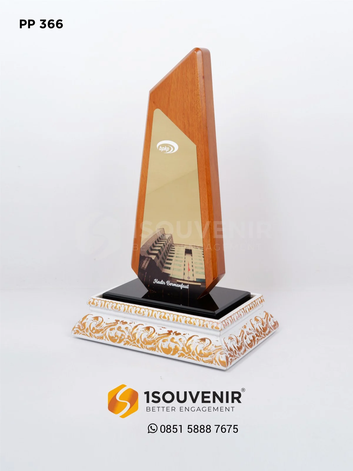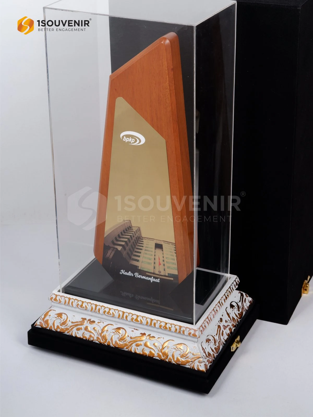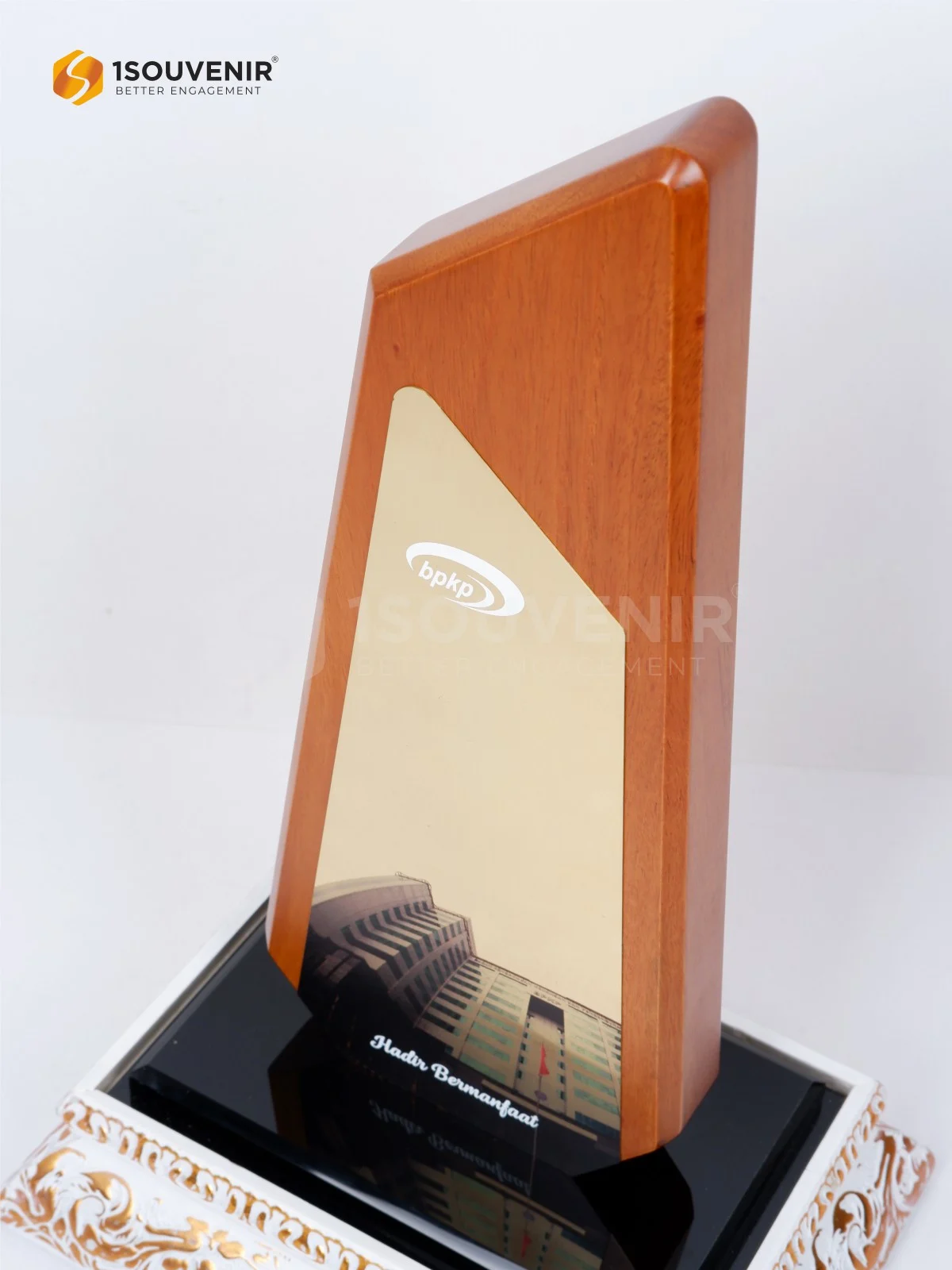 Piala BPKP Hadir Bermanfaat dirancang dengan tampilan elegan yang memadukan kehangatan material kayu, kilau pelat emas, serta detail visual gedung ikonik yang khas. Bentuknya yang kokoh dan berkelas menjadikan penghargaan ini terasa lebih istimewa, sekaligus merepresentasikan makna kontribusi yang memberi dampak positif.