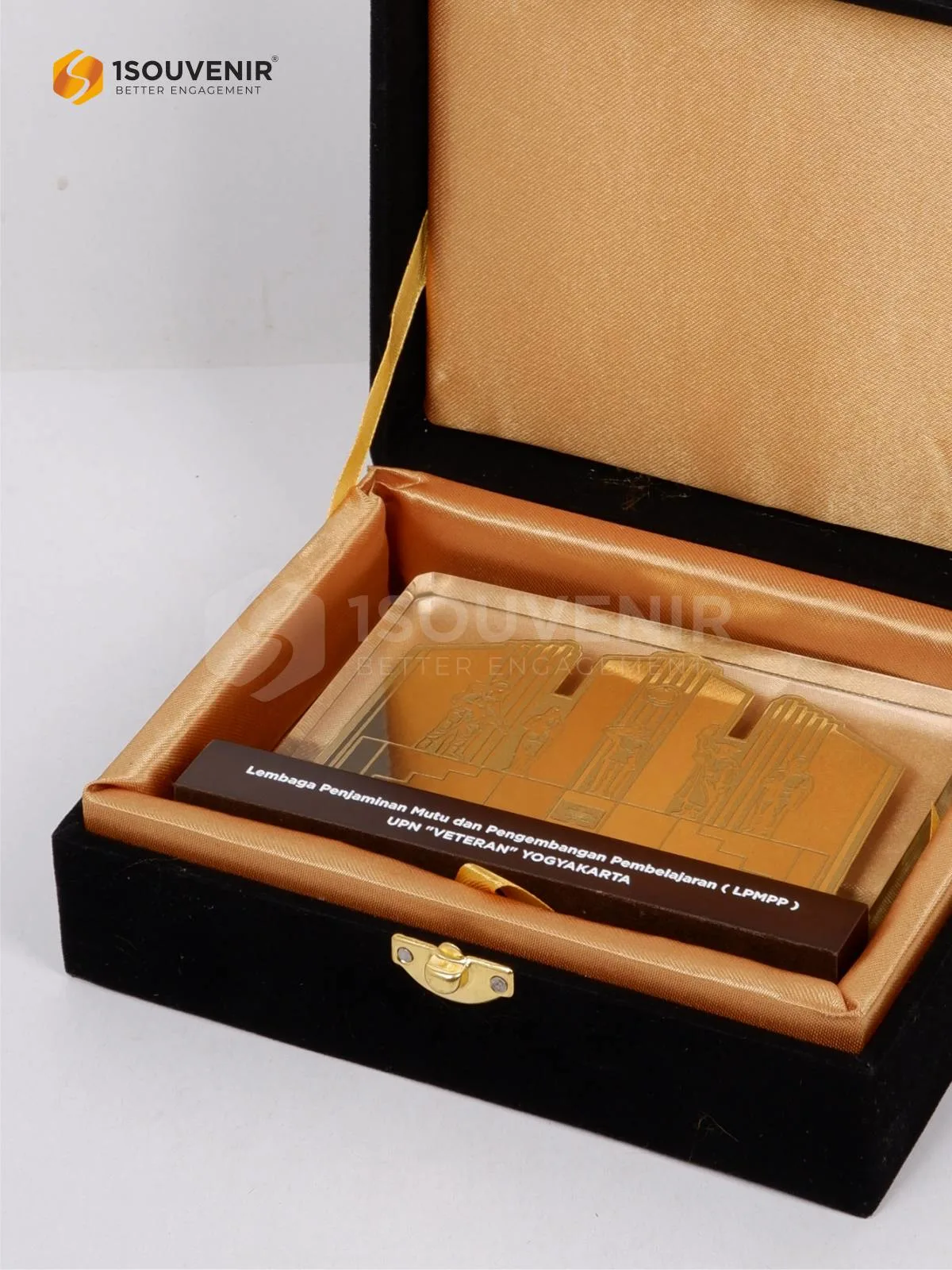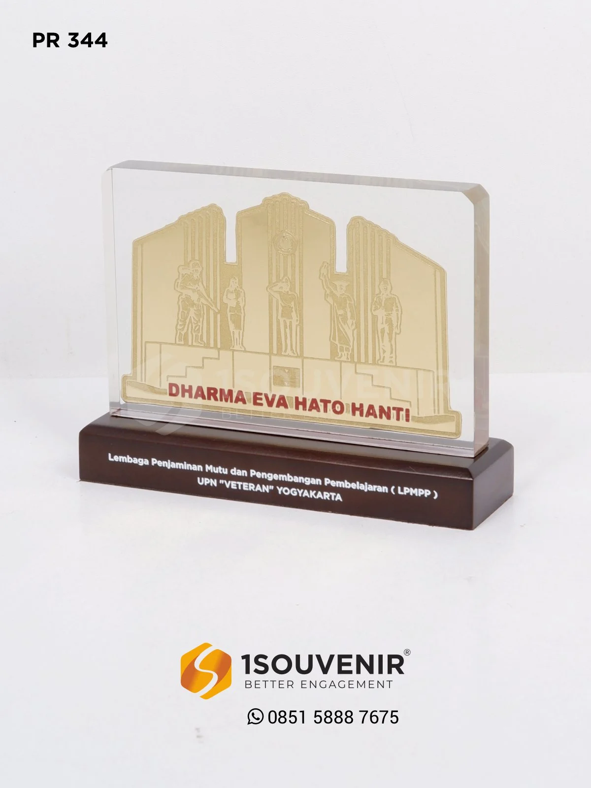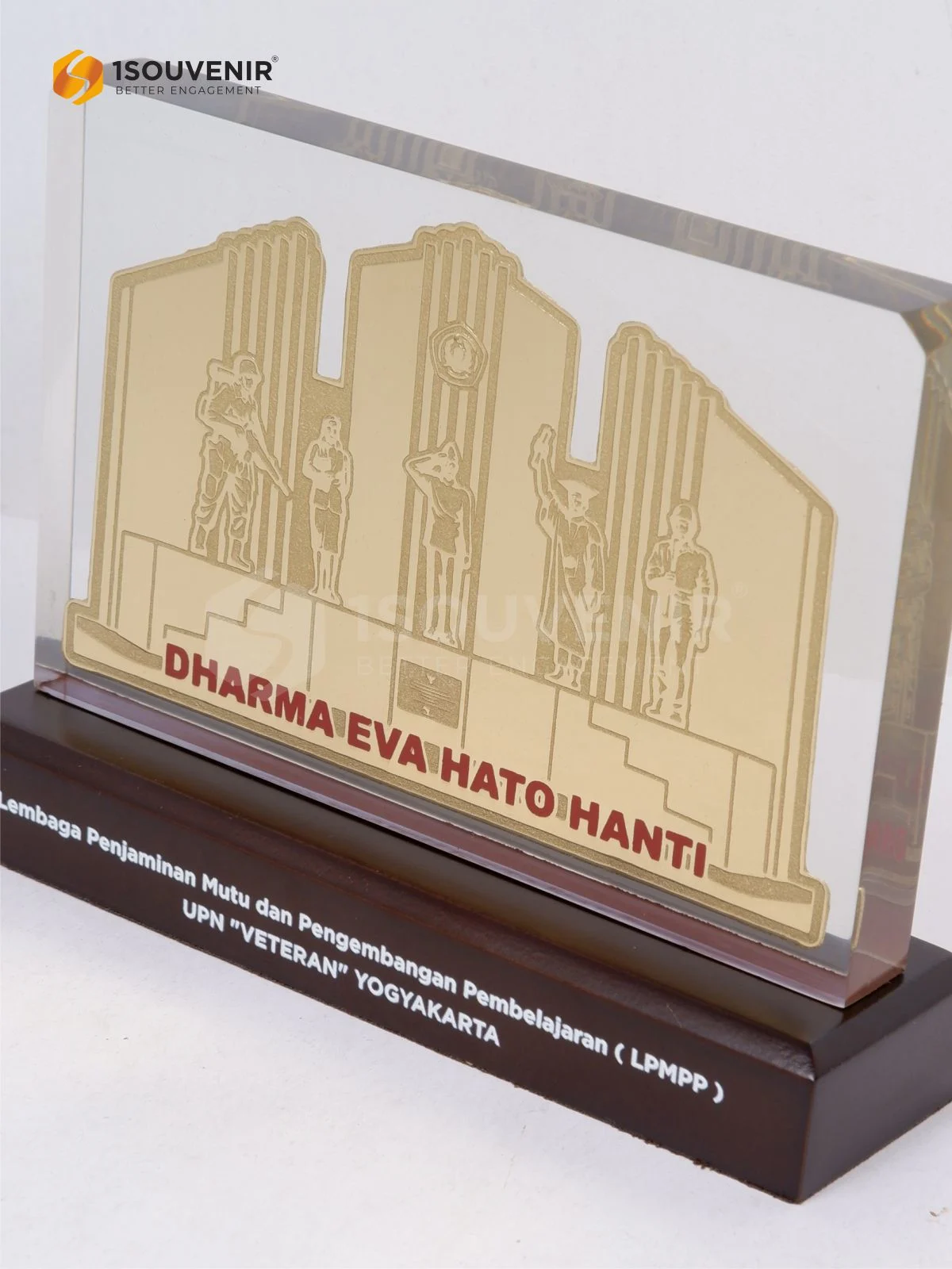 Sebagai bentuk apresiasi sekaligus kenang-kenangan institusi, plakat LPMPP UPN Veteran Yogyakarta dirancang dengan sentuhan artistik yang menampilkan relief ikonik bertuliskan “Dharma Eva Hato Hanti”. Setiap detailnya merepresentasikan nilai pengabdian, semangat pendidikan, serta kebanggaan terhadap identitas kampus.