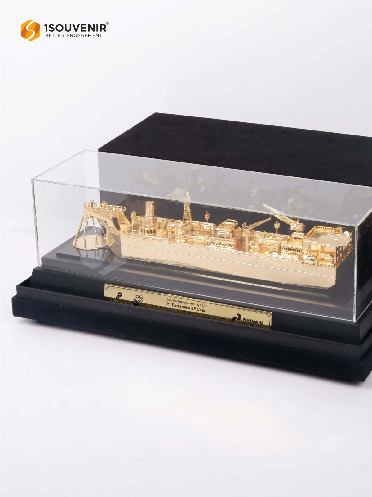 Miniatur Pertamina EP Cepu hadir sebagai simbol kenang-kenangan yang sarat makna. Dengan detail elegan berlapis emas, souvenir miniatur ini merepresentasikan kejayaan industri perminyakan serta menjadi bentuk penghargaan atas kerja sama yang kokoh.