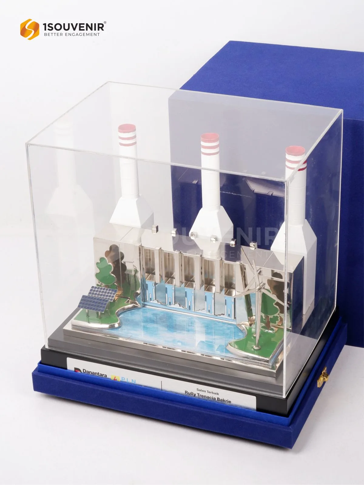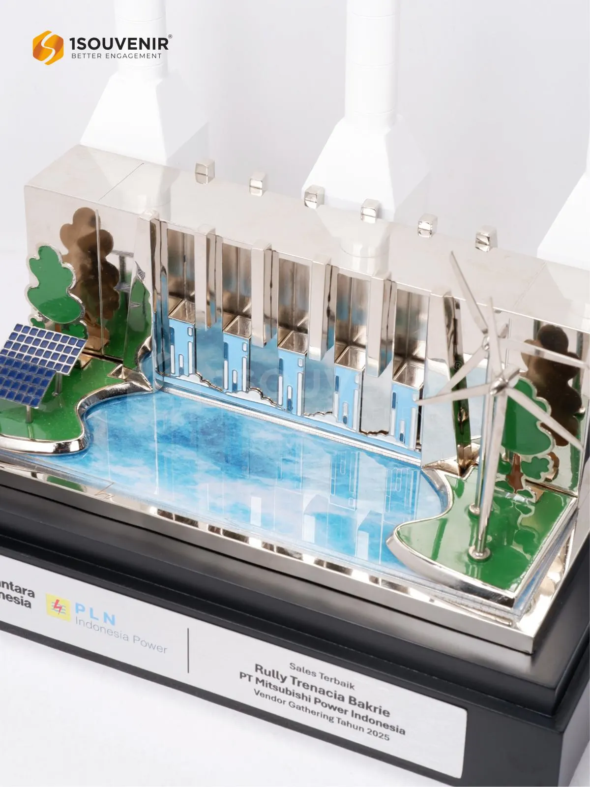 Miniatur Vendor Gathering 2025 ini mencerminkan megahnya infrastruktur energi dengan tiga menara cerobong dan elemen ramah lingkungan yang melambangkan kemajuan teknologi. Dirancang dengan elegan dan penuh detail, souvenir miniatur ini menjadi simbol prestasi dan dedikasi yang tak terlupakan.