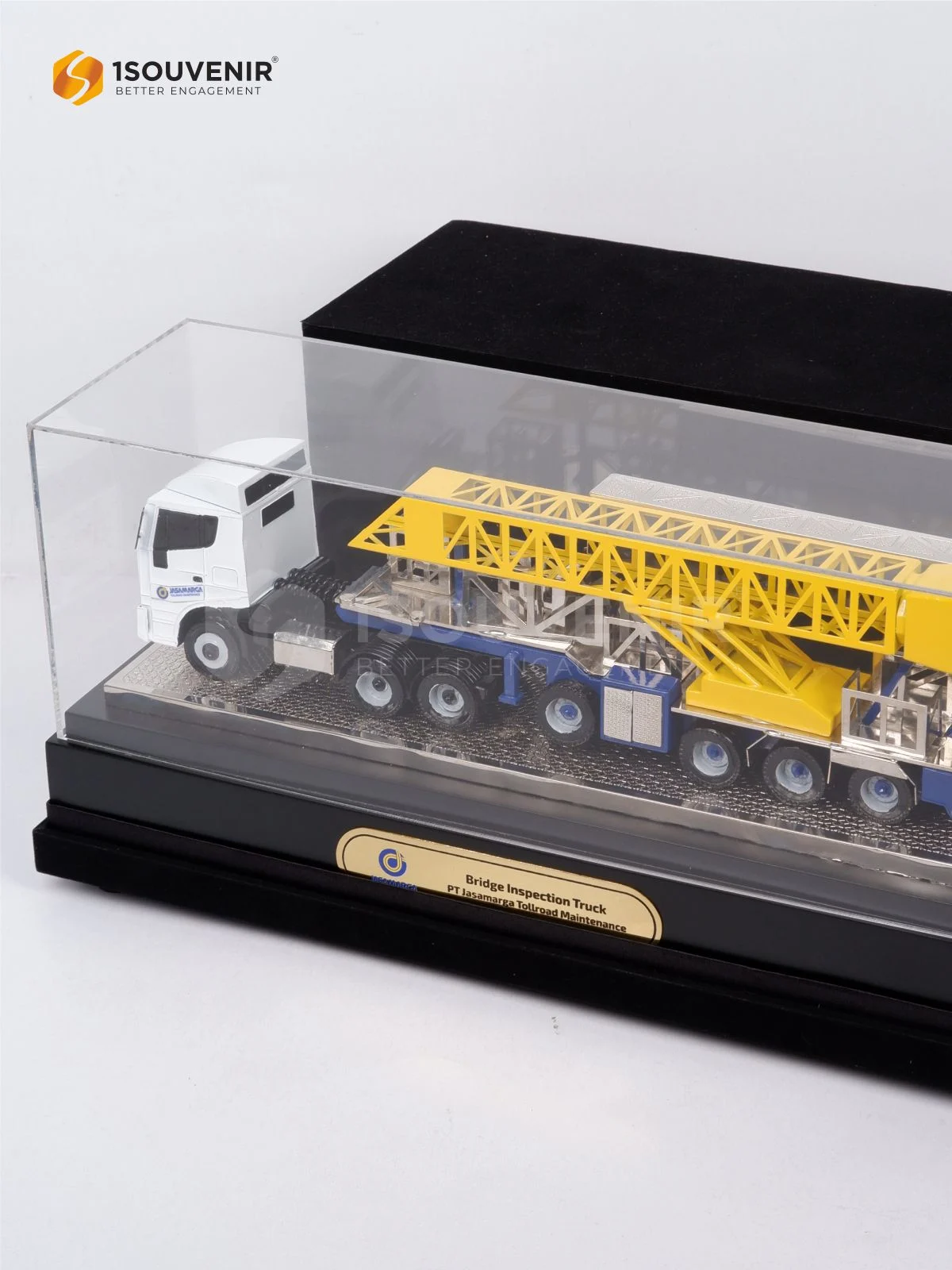 Miniatur Bridge Inspection Truck dari PT Jasamarga Tollroad Maintenance merefleksikan komitmen perusahaan dalam merawat kualitas serta keselamatan infrastruktur jalan tol. Desain miniatur yang detail menampilkan bentuk kendaraan inspeksi dengan presisi tinggi, sehingga menjadi simbol profesionalisme dalam pengelolaan dan pemeliharaan infrastruktur transportasi.