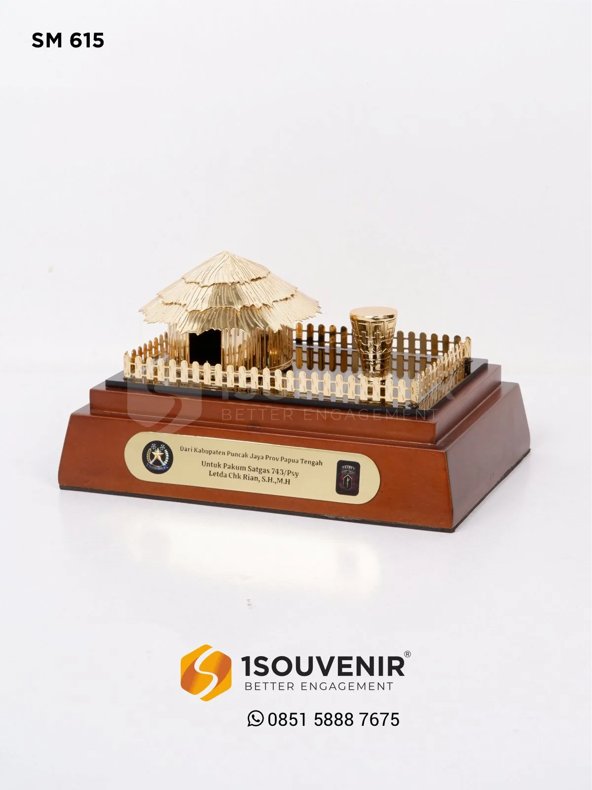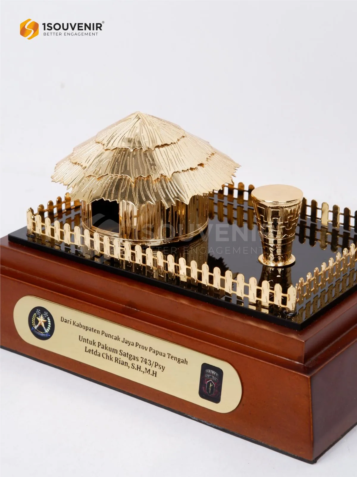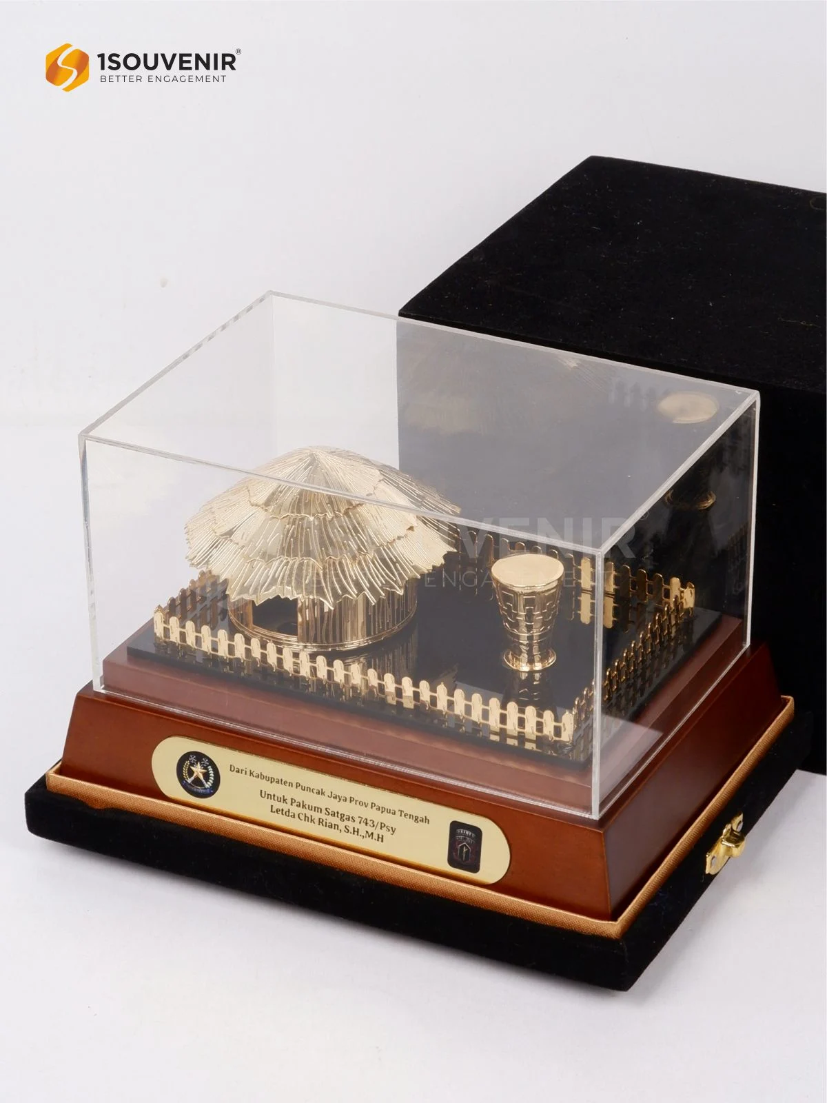 Miniatur honai Pakum Satgas 743/Psy dihadirkan sebagai cendera mata khas yang kaya akan nilai budaya. Desainnya menampilkan rumah adat Papua secara autentik, dipadukan dengan detail logam elegan dan alas kayu, sehingga menciptakan kesan unik dan penuh penghormatan.