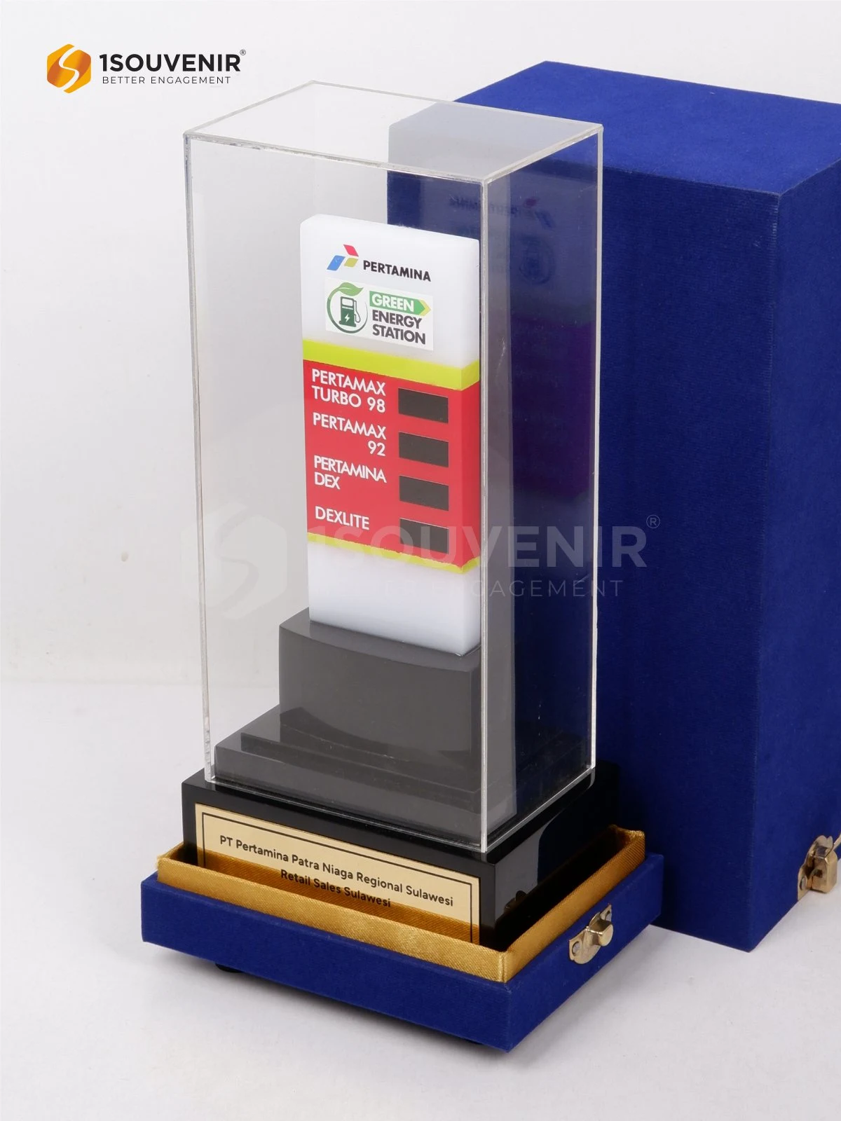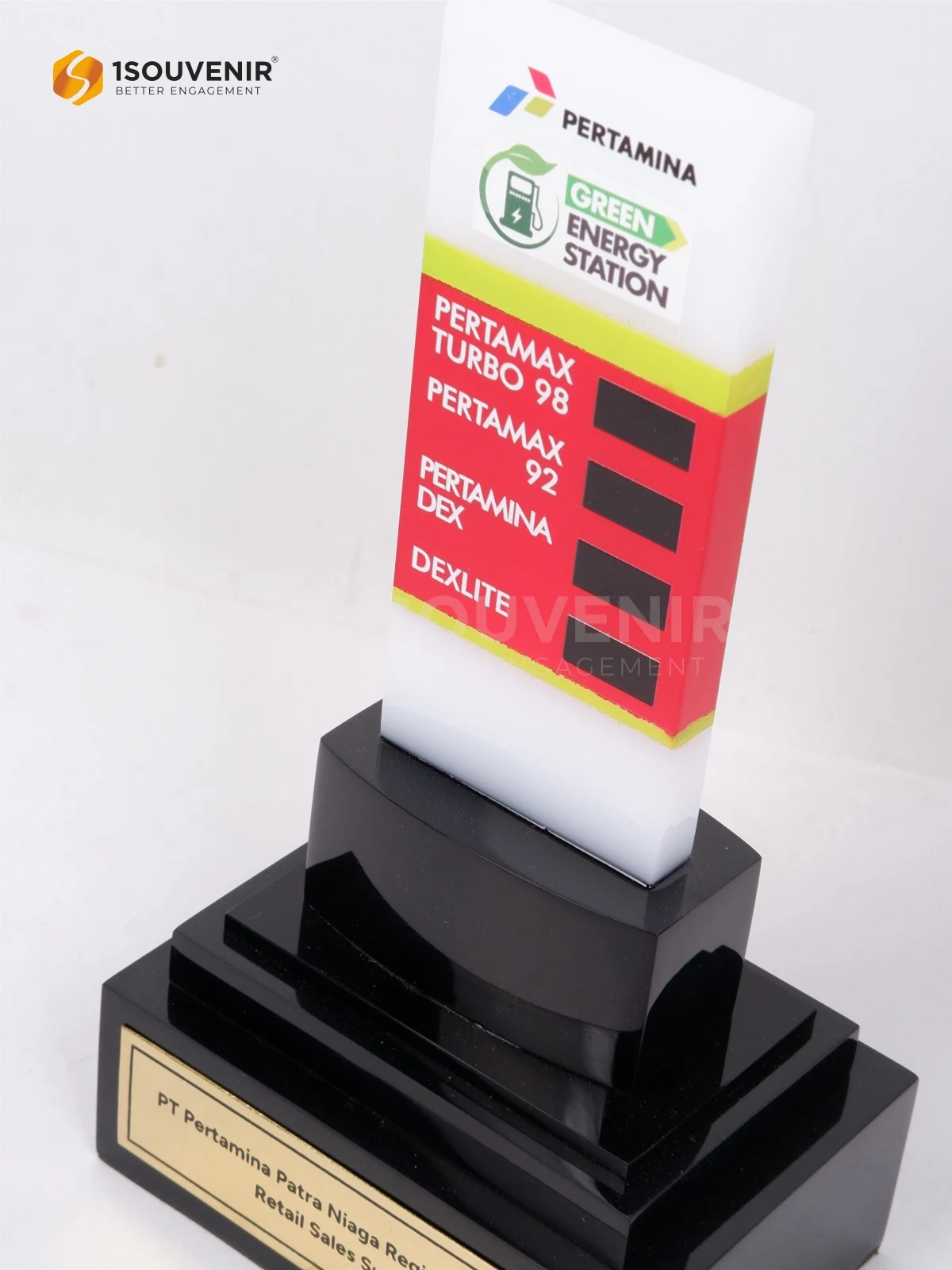 Miniatur Pylon SPBU dihadirkan sebagai kenang-kenangan bermakna dengan desain yang menyerupai penanda SPBU ikonik. Detail warna, logo, serta bentuknya menampilkan identitas Pertamina secara kuat, menjadikannya simbol apresiasi yang unik, profesional, dan representatif.