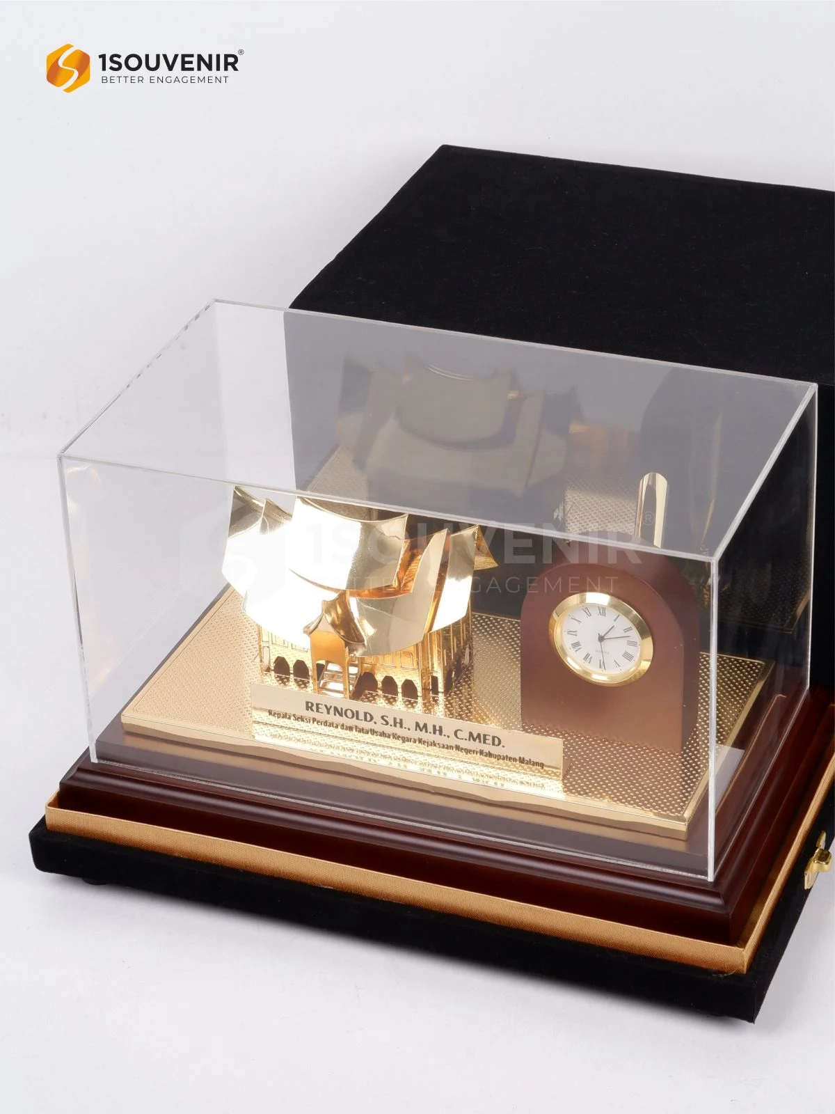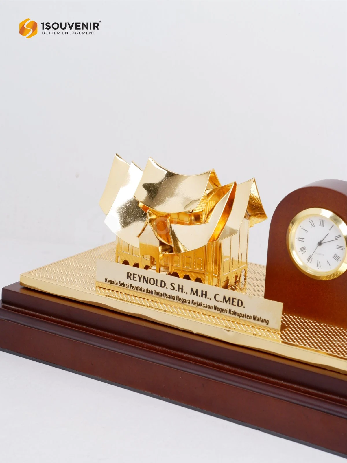 Miniatur Rumah Malang ini dihadirkan sebagai cendera mata yang elegan dan penuh makna. Detail ukiran dengan sentuhan warna emas dipadukan dengan elemen jam di bagian samping, menghadirkan kesan eksklusif sekaligus menjadikannya simbol apresiasi yang tidak hanya estetis, tetapi juga fungsional.