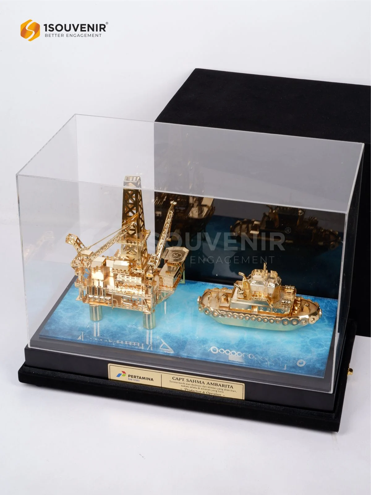 Nilai tersebut tergambar dalam miniatur Pertamina PHE OSES yang menampilkan rig offshore dengan detail presisi, dilengkapi elemen kapal pendukung di atas dasar biru menyerupai laut. Perpaduan ini menghadirkan kesan kuat, profesional, dan penuh karakter sebagai representasi dunia energi.