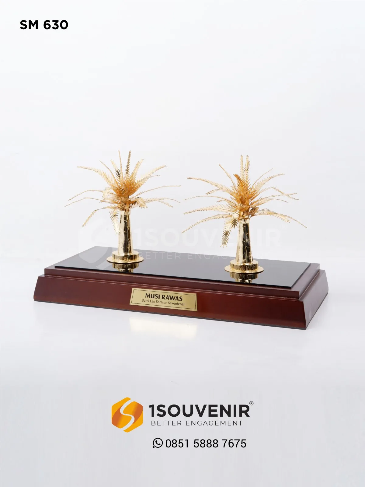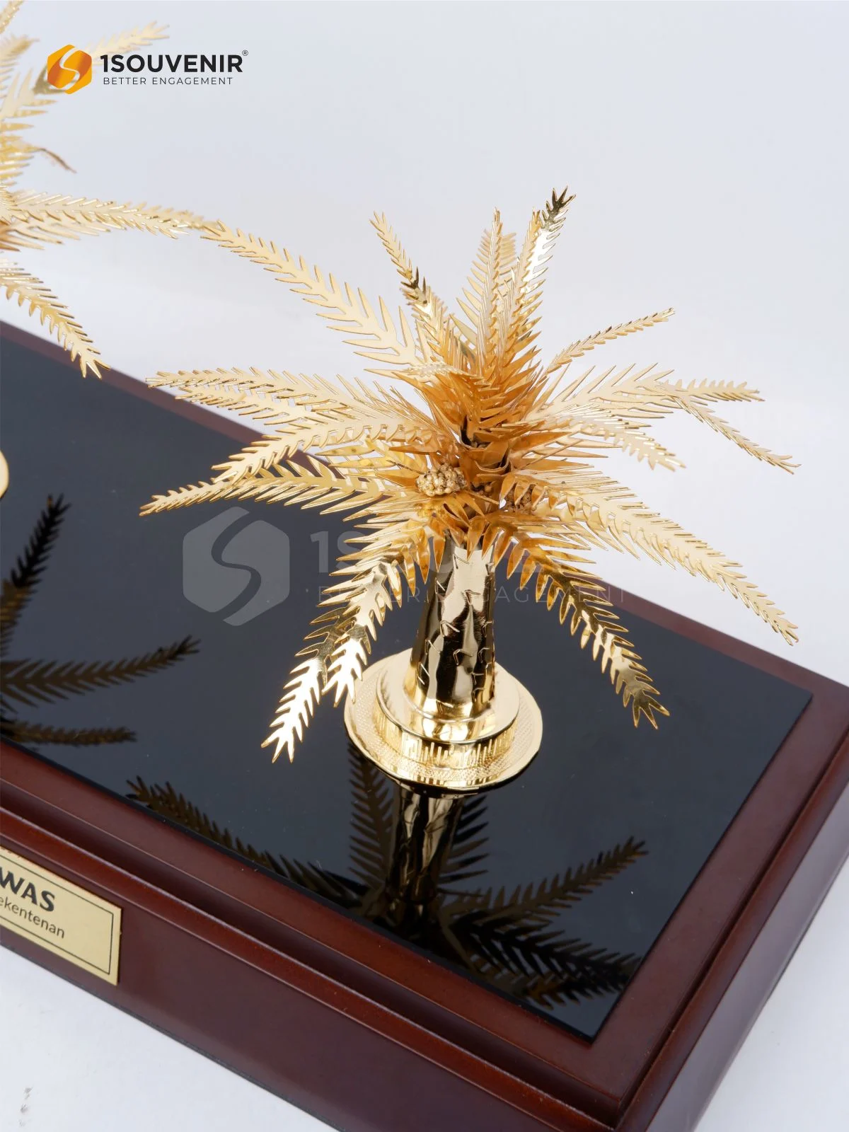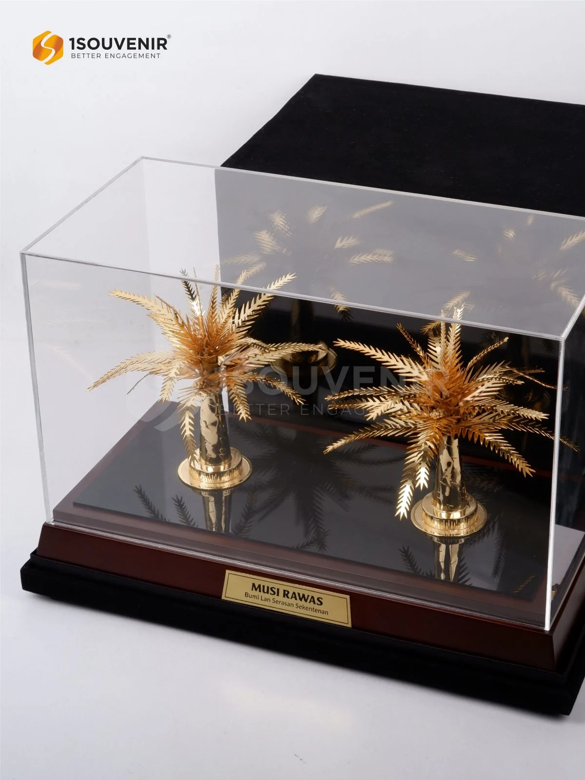 Miniatur Pohon Sawit Musi Rawas ini menghadirkan keindahan tersebut dalam bentuk cendera mata elegan. Dengan detail daun dan batang berwarna emas yang artistik, miniatur ini merepresentasikan identitas daerah sekaligus menjadi simbol kebanggaan yang dapat dikenang sepanjang waktu.