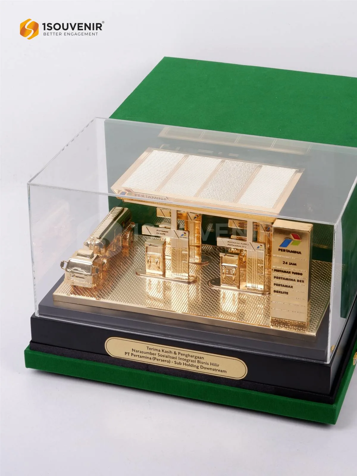 Miniatur SPBU Pertamina Persero ini dipersembahkan sebagai cendera mata untuk para narasumber. Dengan detail desain yang presisi, mulai dari kanopi, dispenser, hingga kendaraan tangki, miniatur ini merepresentasikan peran penting Pertamina dalam distribusi energi.