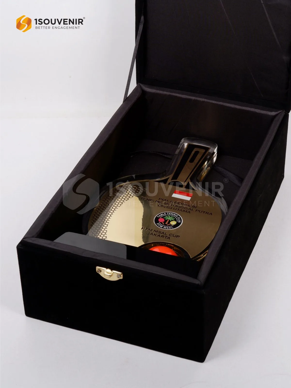 Piala PTM MSAL Cup, yang didesain menyerupai bet tenis meja, hadir sebagai piala bergilir yang merepresentasikan semangat kompetisi tanpa henti serta kejayaan yang diwariskan dari satu juara ke juara berikutnya. Elemen bola merah di bagian dasar menambahkan sentuhan dinamis khas olahraga yang penuh energi ini.