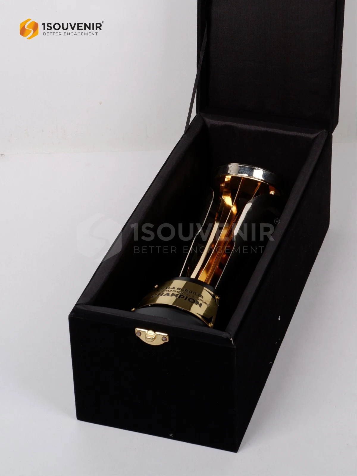 | Teknik | logo kuningan etsa cat krom nikel, badan piala kuningan cutting patri krom emas, sayap kuningan cutting patri krom nikel materi kuningan etsa cat dilengkung baut dudukan |