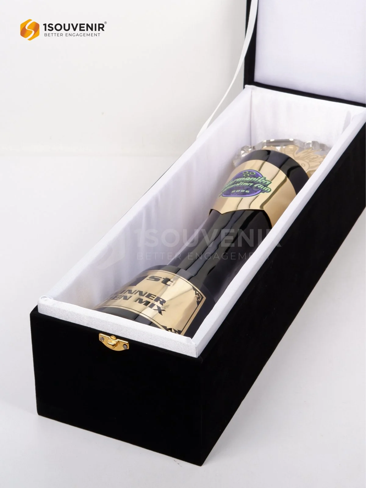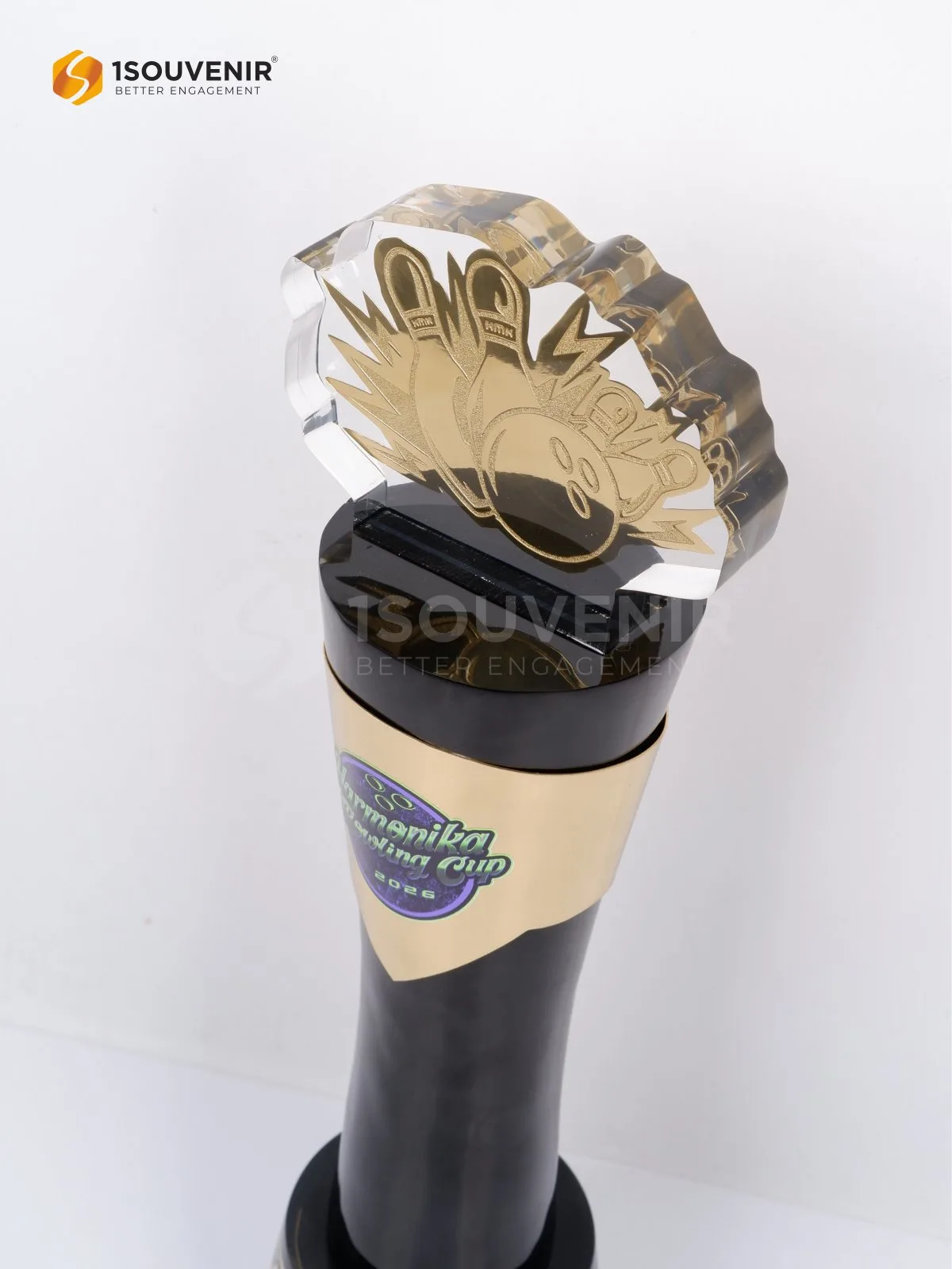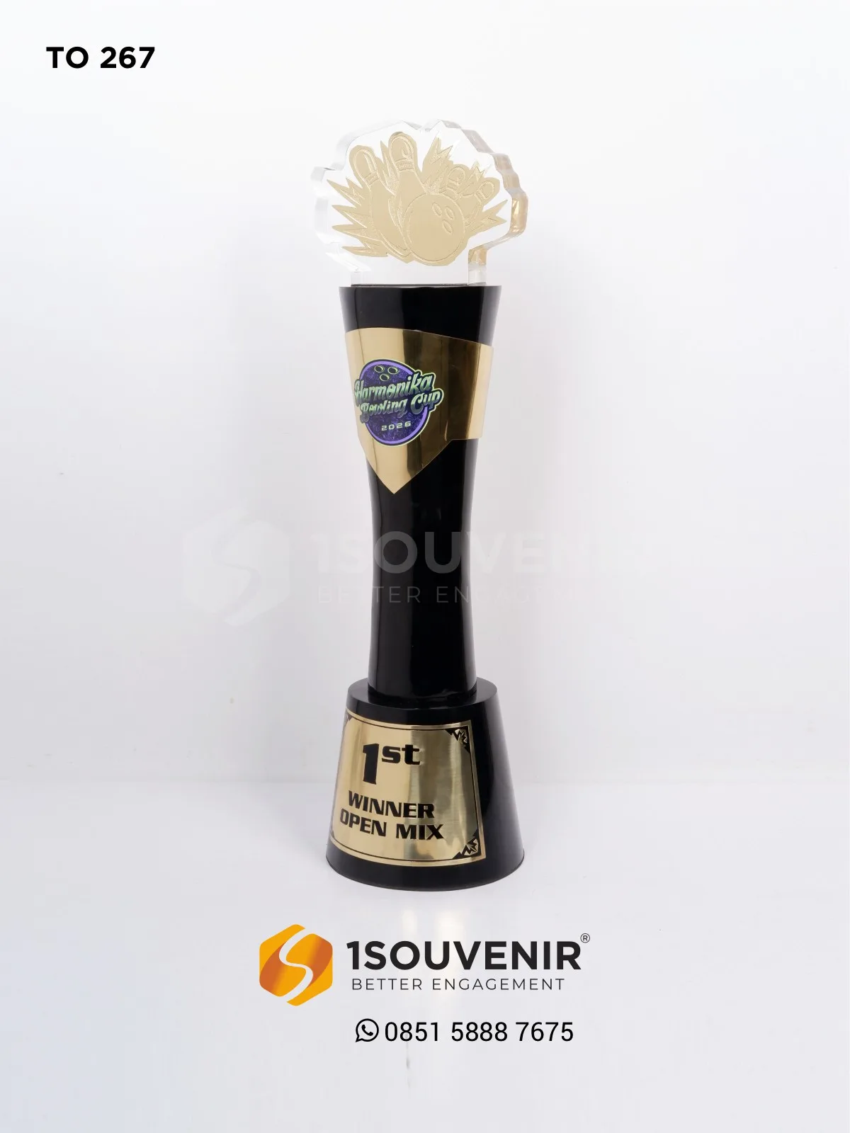 Sebagai simbol pencapaian, piala Winner Open Mix hadir dengan desain elegan melalui kombinasi warna hitam dan emas yang berkelas. Emblem bowling di bagian puncak serta ukiran “1st Winner Open Mix” mempertegas prestasi luar biasa yang diraih, sekaligus menjadi kebanggaan bagi sang pemenang.