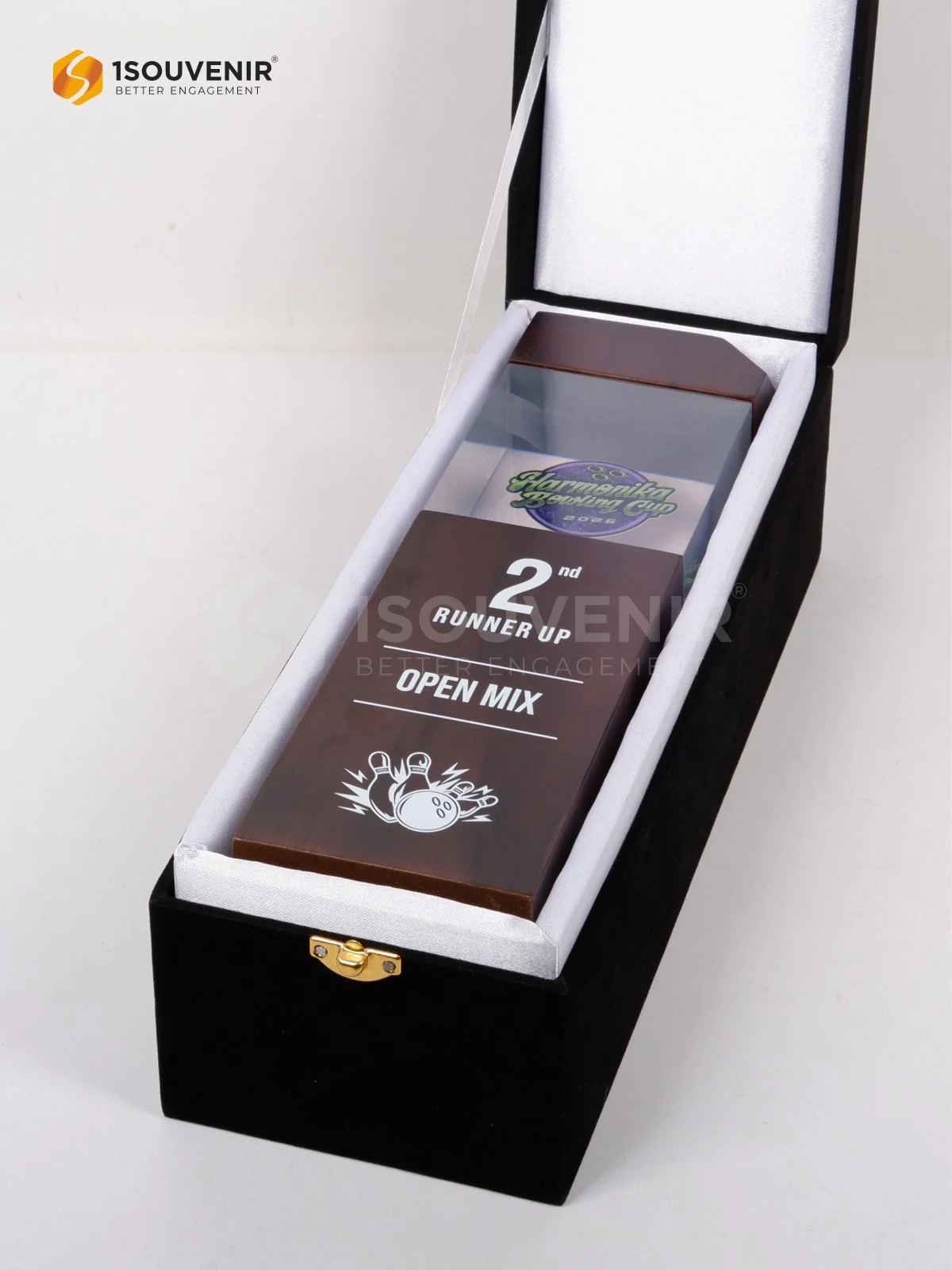 Piala Harmonika Bowling Cup dirancang dengan perpaduan material kayu dan akrilik transparan yang menghadirkan kesan modern sekaligus elegan. Logo serta grafis bowling yang terukir pada bagian piala memperkuat identitas kompetisi dan menjadikannya simbol prestasi yang membanggakan bagi penerimanya.